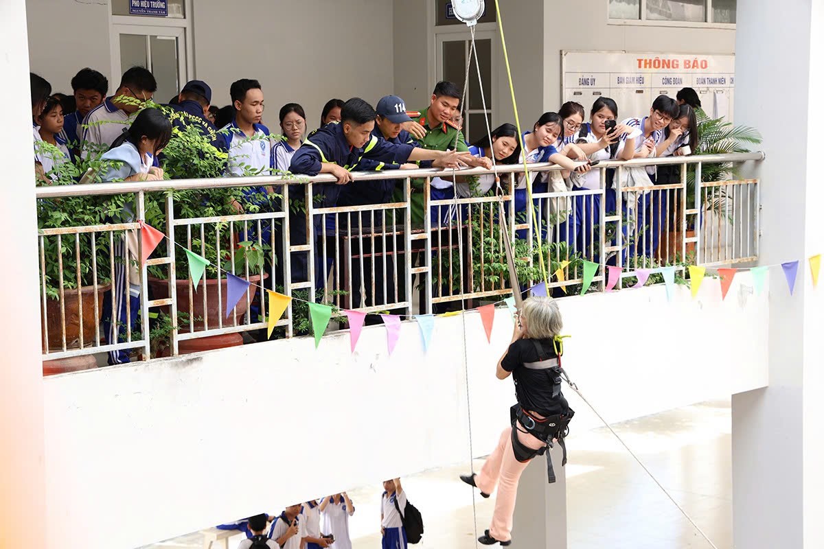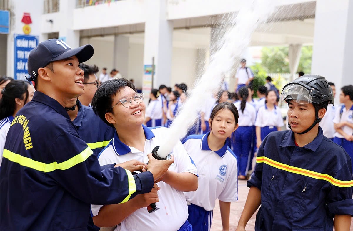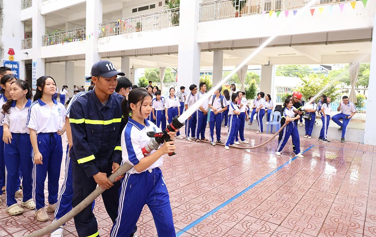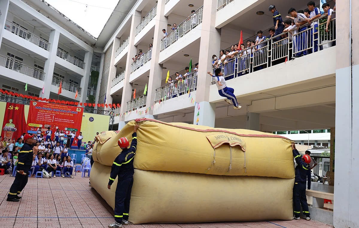 Bên cạnh đó, lực lượng chữa cháy chuyên nghiệp giới thiệu các kỹ năng, biện pháp phòng ngừa cháy, nổ trong trường học, gia đình và khu dân cư; cách xử lý tình huống, kỹ năng thoát nạn an toàn; giới thiệu các trang thiết bị, phương tiện chữa cháy và cứu nạn, cứu hộ của lực lượng Cảnh sát PCCC và CNCH. Dịp này, giáo viên và học sinh cũng được trải nghiệm các thao tác sử dụng bình chữa cháy xách tay dập tắt đám cháy do rò rỉ khí gas; trải nghiệm thoát nạn bằng dây hạ chậm; trải nghiệm cứu người, sử dụng máy cắt, máy ép sắt phục vụ công tác cứu nạn cứu hộ và thực hành phun nước chữa cháy...