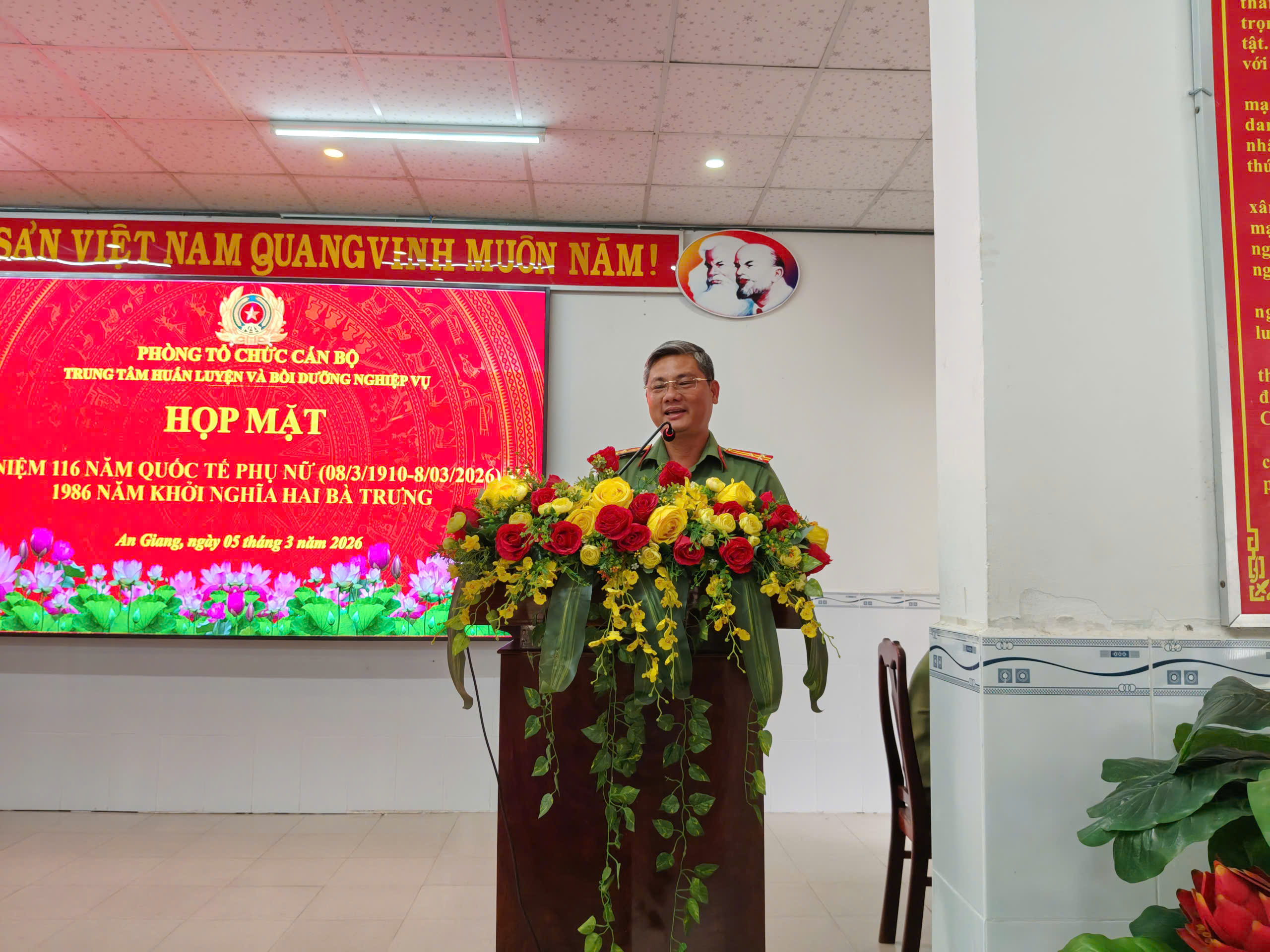 Chiều ngày 05/3/2026, trong không khí vui tươi và phấn khởi, Trung tâm Huấn luyện và Bồi dưỡng nghiệp vụ thuộc Phòng Tổ chức Cán bộ Công an tỉnh đã tổ chức buổi họp mặt, thăm hỏi và động viên các cán bộ, công nhân viên nữ tại Trung tâm và các học viên nữ lớp Trung cấp lý luận chính trị B196, Trường Chính trị Tôn Đức Thắng. Buổi lễ diễn ra nhân dịp kỷ niệm 116 năm Ngày Quốc tế Phụ nữ 08/3 và 1986 năm Khởi nghĩa Hai Bà Trưng.