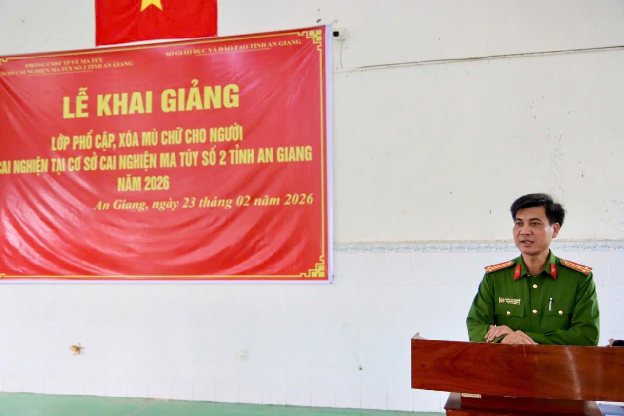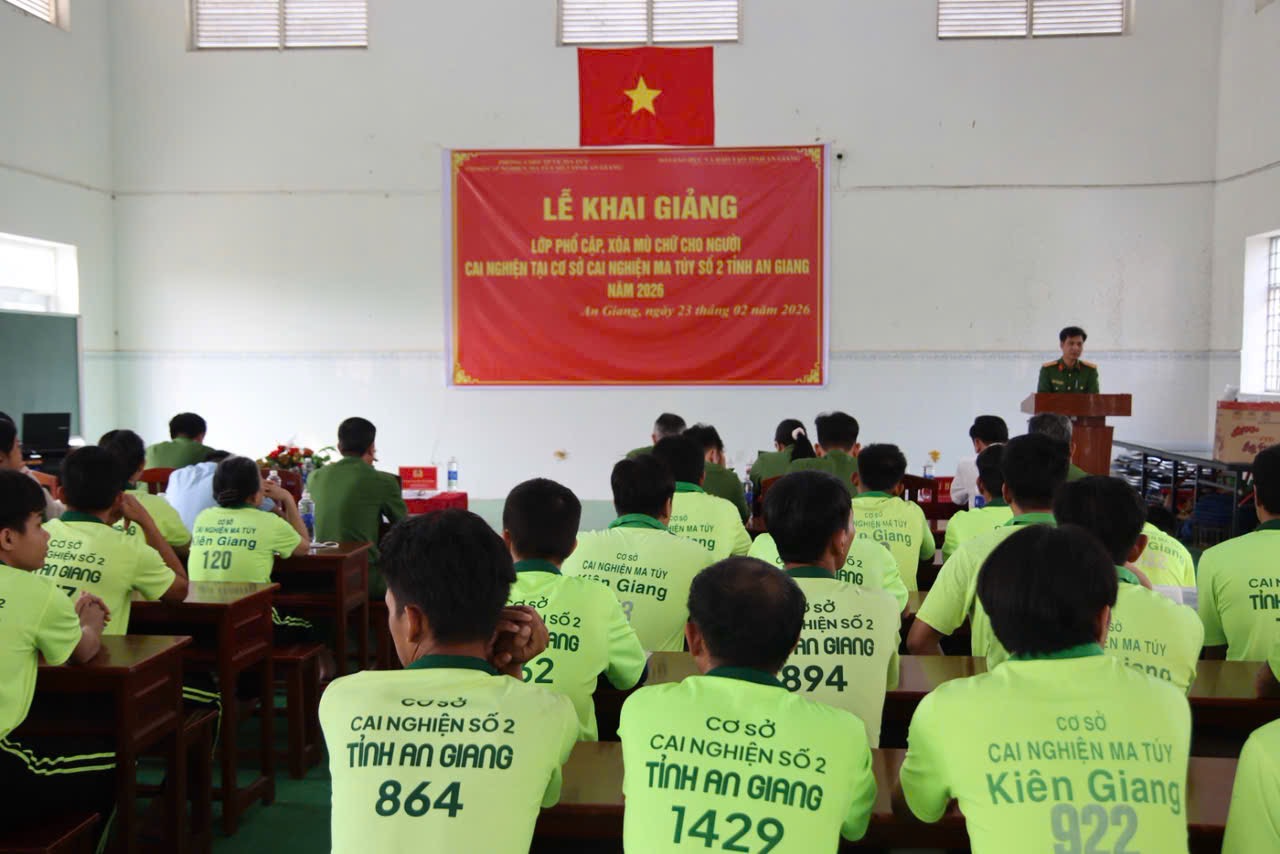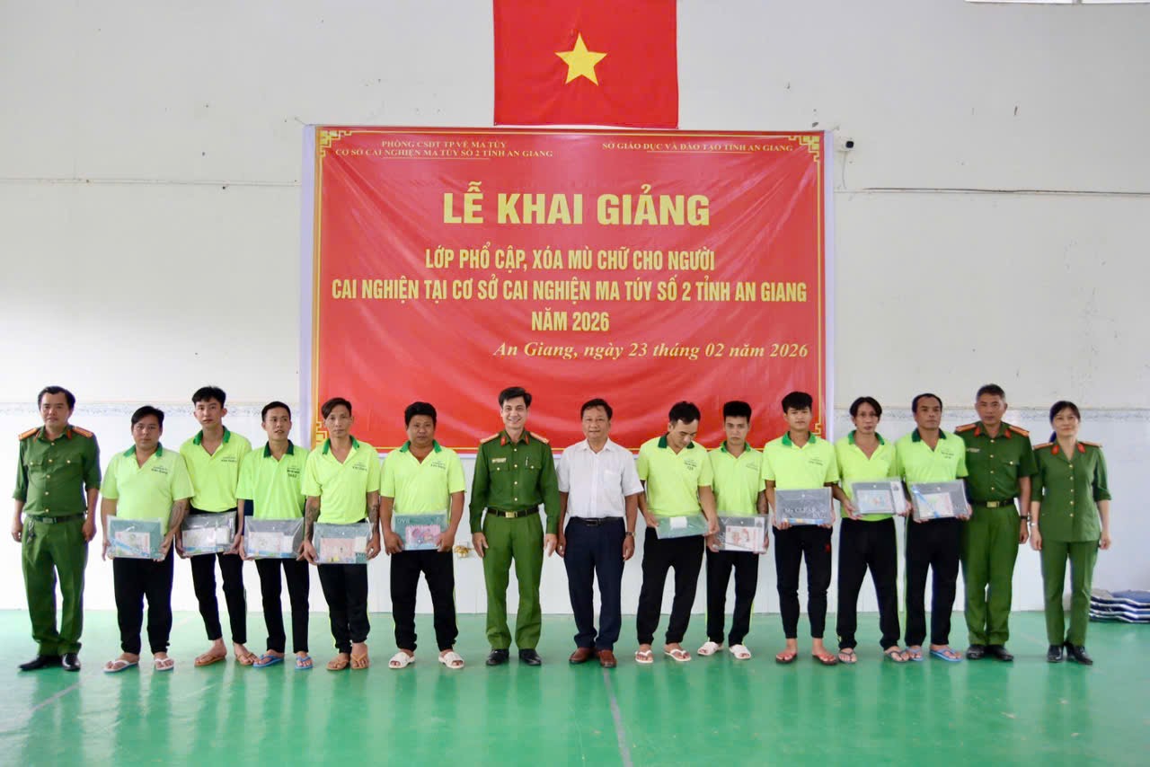 Sáng ngày 23/02/2026, Phòng Cảnh sát điều tra tội phạm về ma túy Công an tỉnh An Giang phối hợp Sở Giáo dục và Đào tạo tỉnh tổ chức Lễ khai giảng lớp phổ cập, xóa mù chữ dành cho học viên đang cai nghiện tại Cơ sở cai nghiện ma túy số.