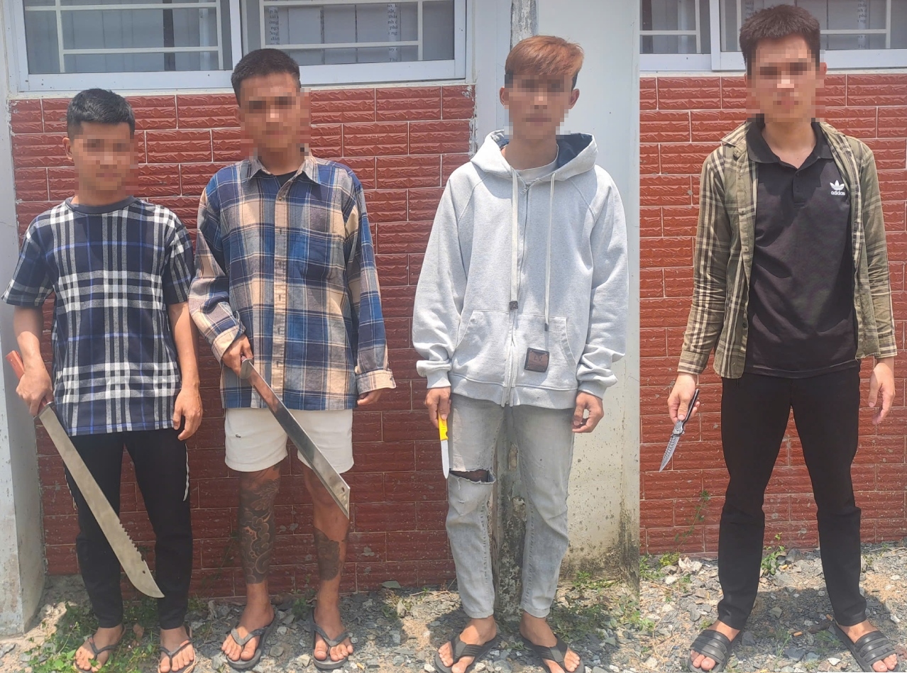 Ngay sau khi tiếp nhận thông tin, Công an xã đã nhanh chóng triển khai lực lượng đến hiện trường kiểm tra. Phát hiện lực lượng Công an, các đối tượng bỏ chạy. Bằng các biện pháp nghiệp vụ, lực lượng chức năng đã kịp thời khống chế, tạm giữ 04 đối tượng cùng 01 xe mô tô và 01 xe đạp điện; đồng thời thu giữ 02 dao tự chế và 01 dao.