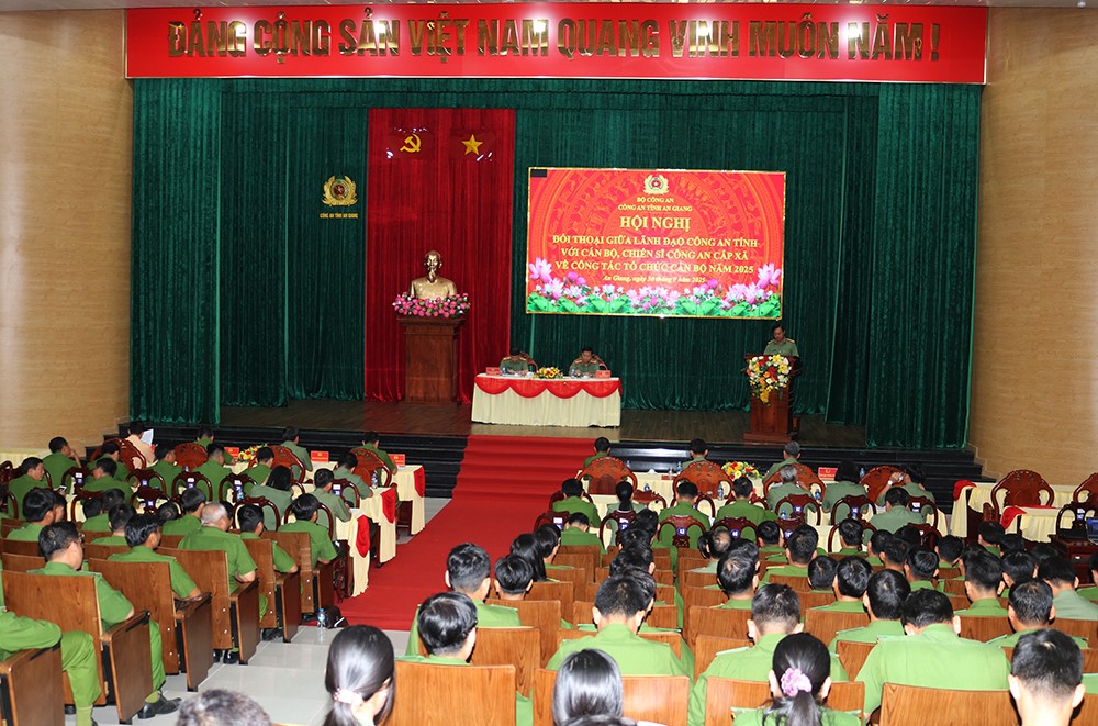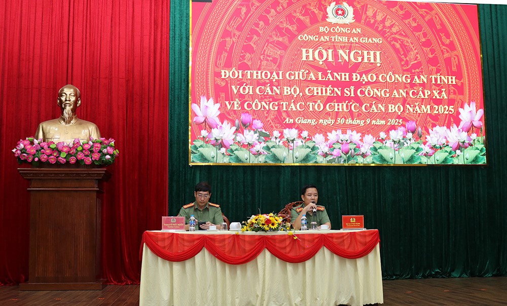 Sáng ngày 30/9/2025, Công an tỉnh An Giang tổ chức Hội nghị đối thoại giữa lãnh đạo Công an tỉnh với cán bộ, chiến sĩ Công an cấp xã về công tác tổ chức cán bộ năm 2025. Đại tá Lê Phú Thạnh, Tỉnh ủy viên, Phó Bí thư Đảng ủy, Phó Giám Đốc Công an tỉnh chủ trì Hội nghị. Tham dự Hội nghị còn có lãnh đạo một số đơn vị nghiệp vụ Công an tỉnh; Chỉ huy, cán bộ Công an xã, phường, đặc khu trên địa bàn tỉnh.