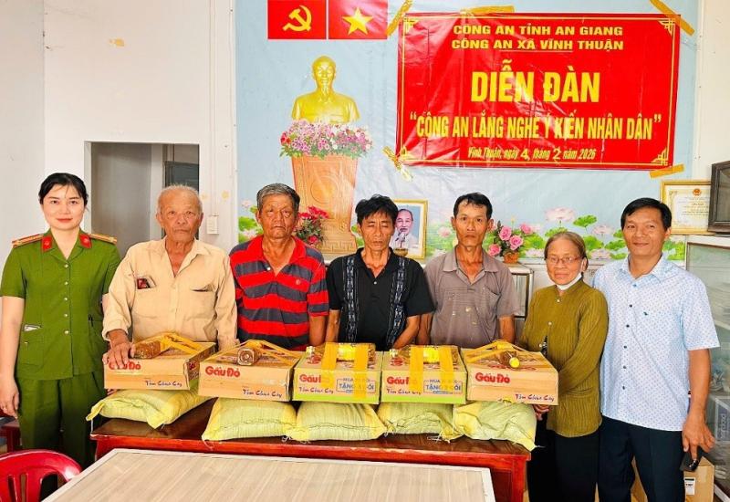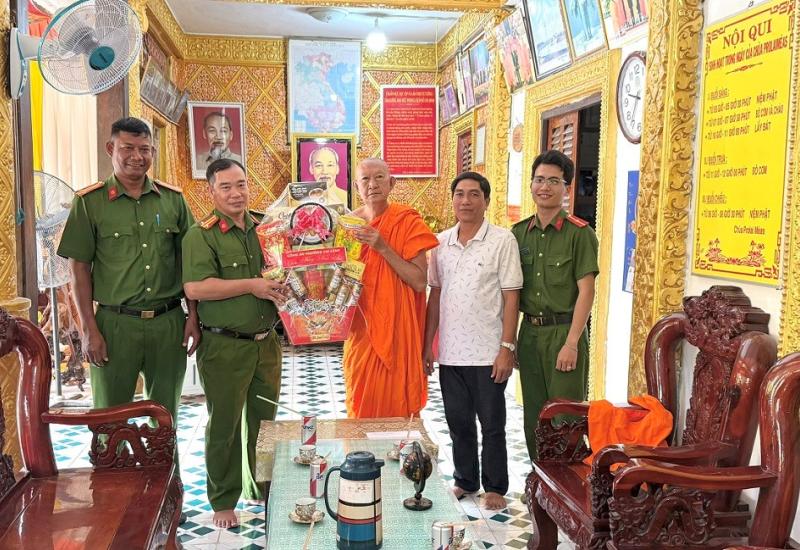 Phó Chủ tịch UBND tỉnh An Giang Lê Văn Phước (phải) tặng quà, chúc mừng lễ kỷ niệm 105 năm Ngày Đản sinh Đức Huỳnh Giáo chủ Phật giáo Hòa Hảo.