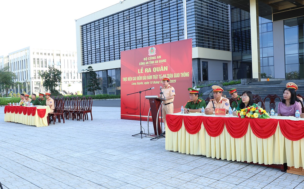 Sáng 15/10/2025, Phòng Cảnh sát giao thông Công an tỉnh An Giang phối hợp với Công an phường Long Xuyên tổ chức Lễ ra quân thực hiện cao điểm bảo đảm trật tự, an toàn giao thông (TTATGT) trên địa bàn tỉnh. Tham dự Lễ ra quân có đại diện lãnh đạo Phòng Cảnh sát giao thông; Cấp uỷ, UBND phường Long Xuyên; lãnh đạo Công an các phường Long Xuyên, Bình Đức, Mỹ Thới và Công an 02 xã An Châu và Phú Hoà.