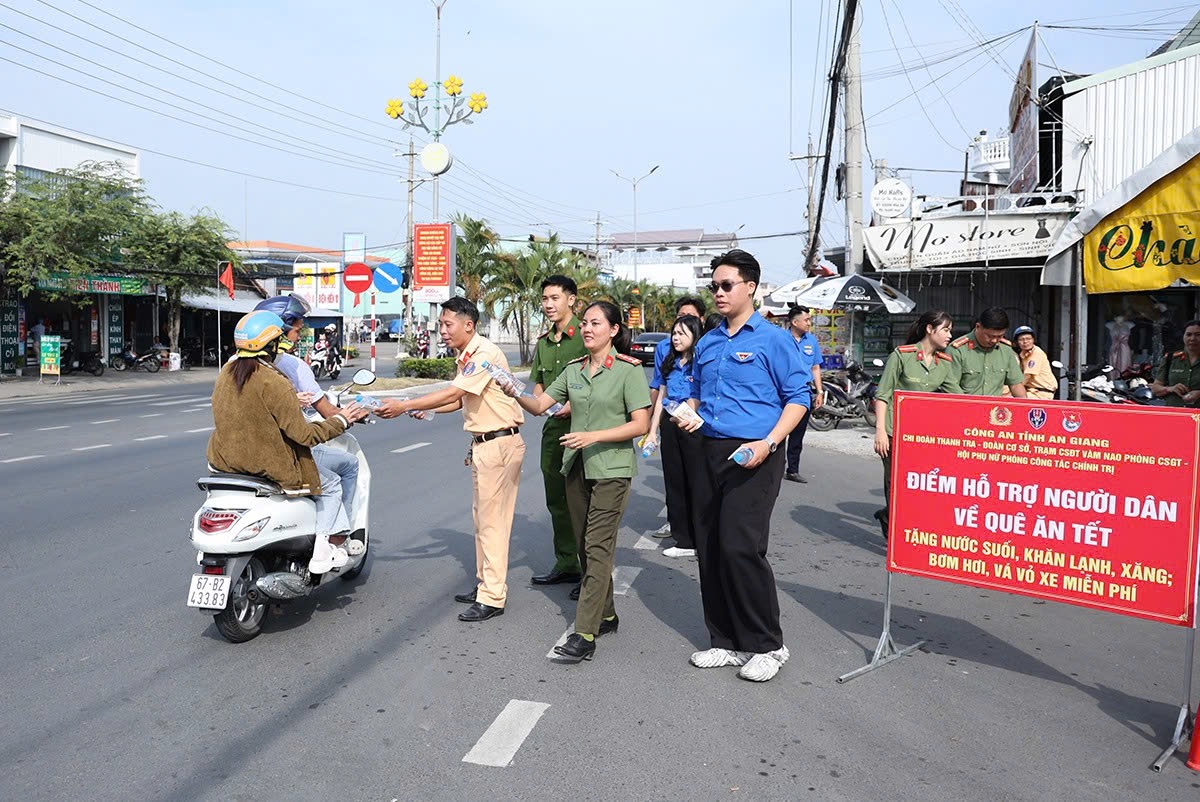 ‎Nhằm tiếp sức cho người dân trên đường về quê đón Tết Nguyên đán Bính Ngọ 2026, sáng ngày 14/2, Chi đoàn Thanh tra Công an tỉnh An Giang phối hợp với Ban Phụ nữ Công an tỉnh, lực lượng đoàn viên Trạm Cảnh sát đường thuỷ Vàm Nao (thuộc Đoàn cơ sở Phòng Cảnh sát giao thông), Chi đoàn Công an phường Mỹ Thới và Phường đoàn Bình Đức tổ chức “Điểm hỗ trợ người dân về quê ăn Tết” trên Quốc lộ 91, đoạn thuộc phường Mỹ Thới, tỉnh An Giang.