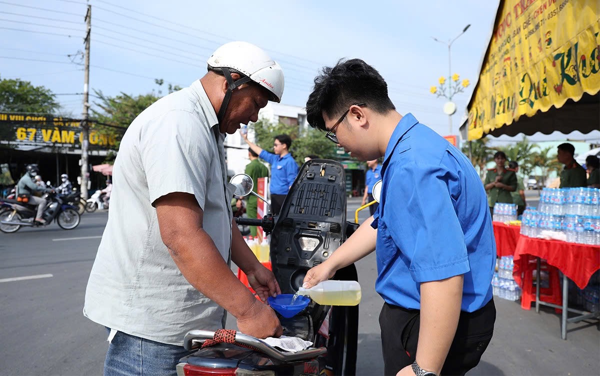 Các lực lượng tuyên truyền, hướng dẫn người dân tham gia giao thông an toàn, đổ xăng và bơm xe cho người dân