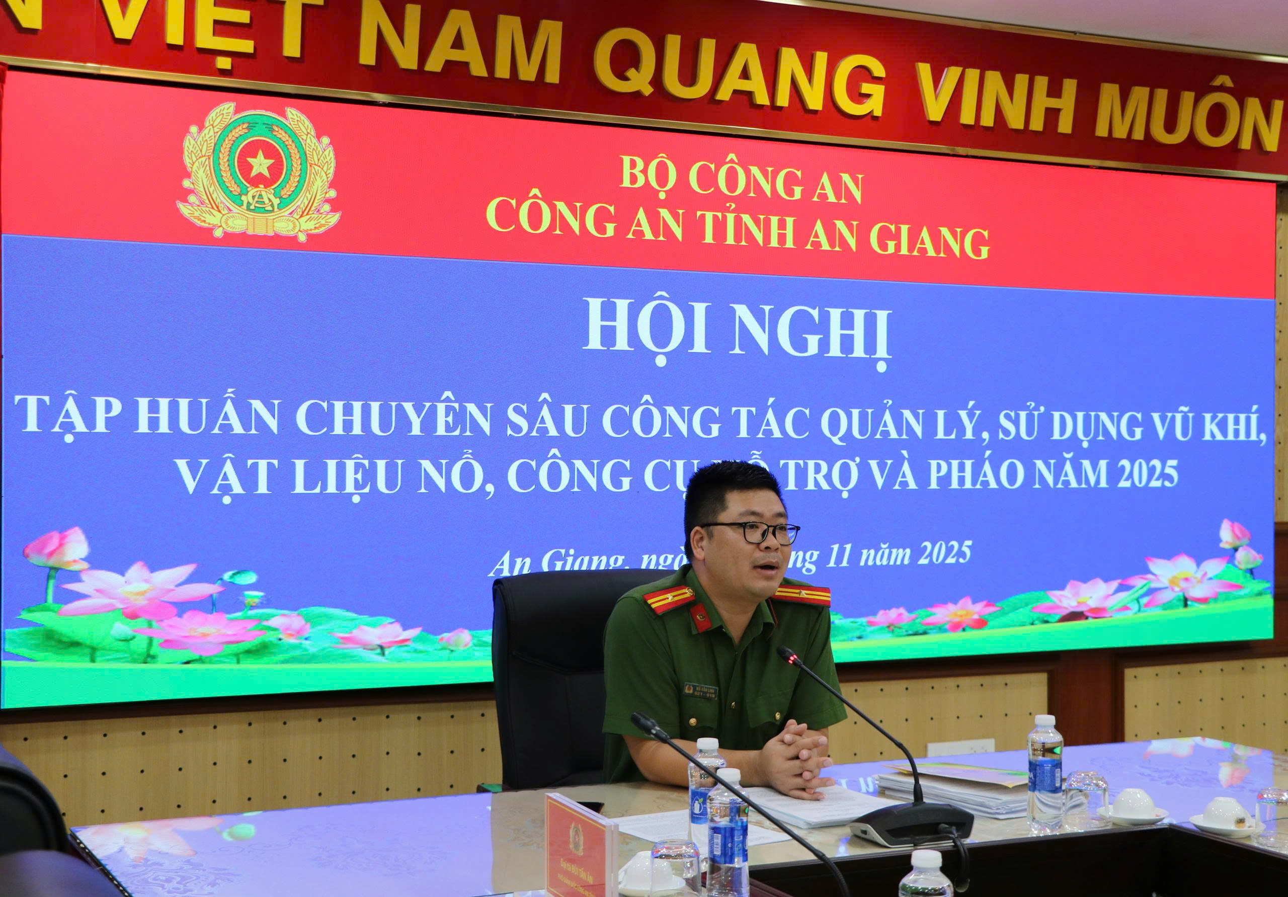Sáng ngày 6/11/2025, Công an tỉnh An Giang phối hợp với Cục Cảnh sát Quản lý hành chính về trật tự xã hội (C06) – Bộ Công an tổ chức Hội nghị tập huấn chuyên sâu công tác quản lý, sử dụng vũ khí, vật liệu nổ, công cụ hỗ trợ và pháo năm 2025. Hội nghị được tổ chức theo hình thức trực tuyến đến Công an các xã, phường và đặc khu trên địa bàn tỉnh, nhằm nâng cao hiệu quả công tác quản lý nhà nước về lĩnh vực này, đáp ứng yêu cầu thực tiễn trong tình hình mới.