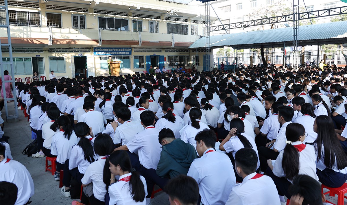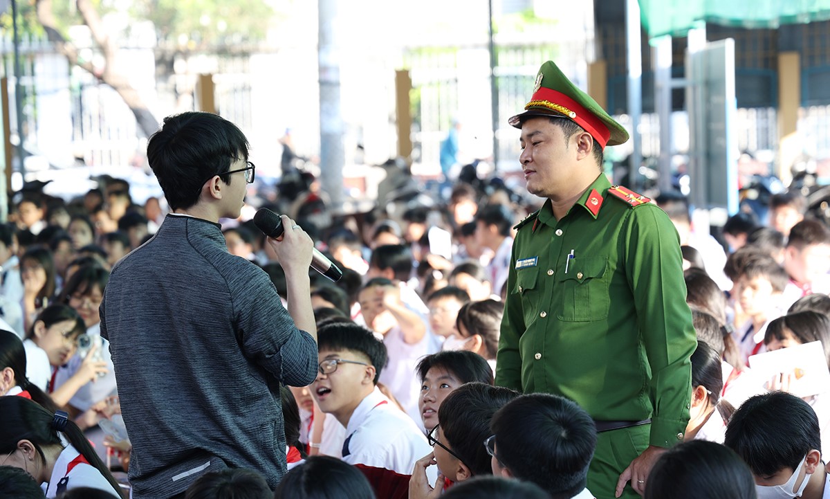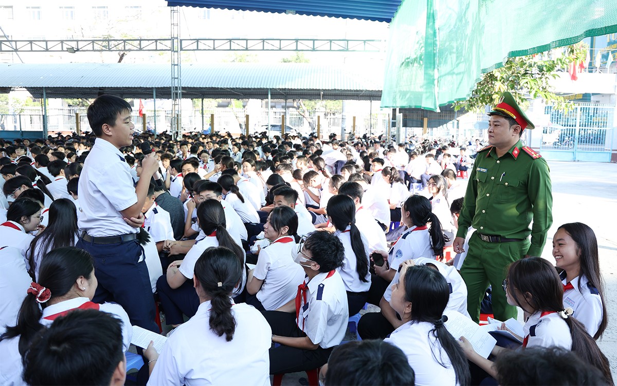 Bên cạnh đó, cán bộ Công an phường cũng tuyên truyền đến các em về tình trạng bạo lực học đường, các phương thức thủ đoạn hoạt động của các loại tội phạm như: tội phạm có tổ chức và tín dụng đen, mua bán người, xâm hại trẻ em, ma túy, tội phạm công nghệ cao và tội phạm trật tự xã hội; đồng thời phân tích các hành vi, nhận diện thủ đoạn lôi kéo học sinh tham gia; hướng dẫn cách phòng tránh. Để nội dung buổi tuyên truyền được sôi nổi, phong phú, vui tươi, phấn khởi và đạt hiệu quả cao, cán bộ tuyên truyền còn đưa ra những tình huống và câu hỏi thực tế khi tham gia giao thông để giao lưu, trao đổi với các em.