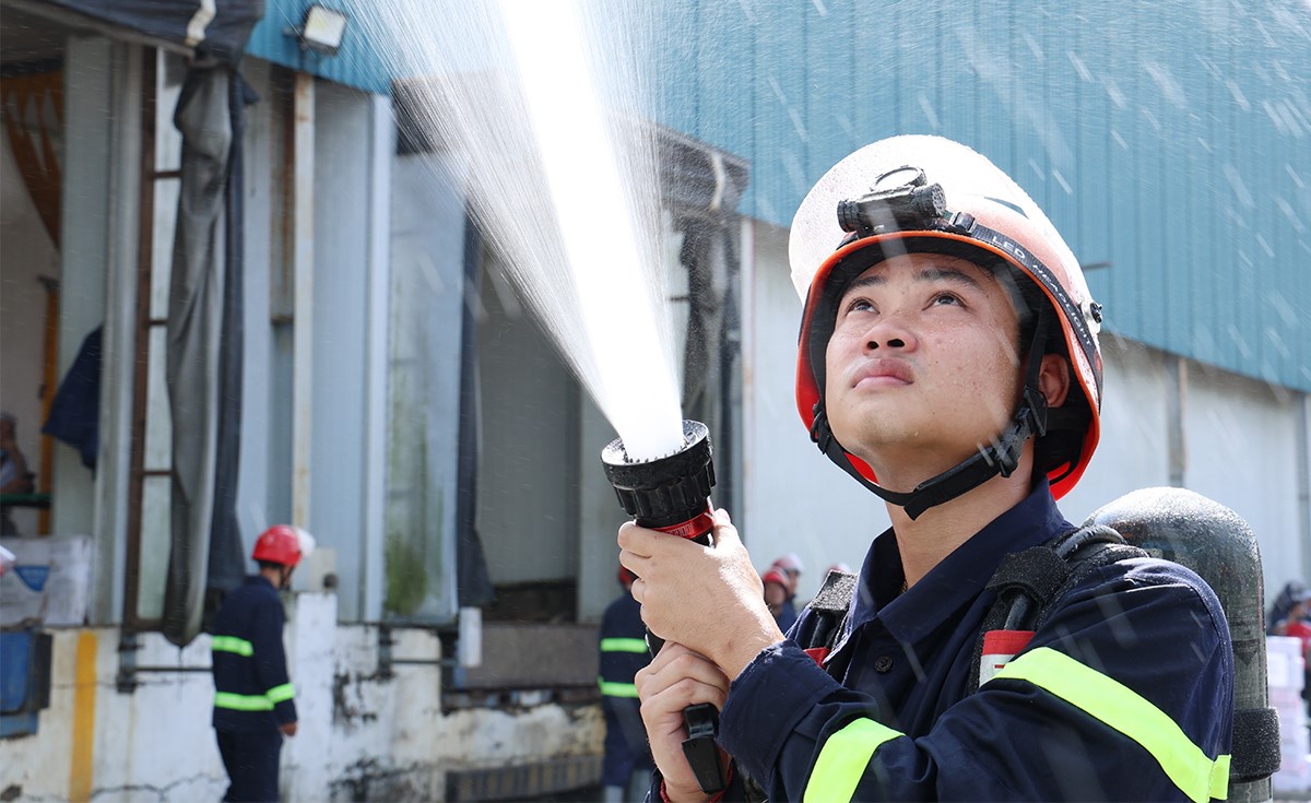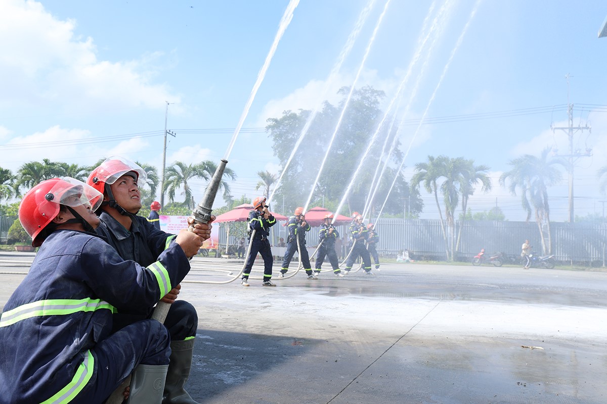 Tình huống giả định, vào khoảng 9 giờ cùng ngày, tại khu vực xưởng sản xuất của Công ty Cổ phần xuất, nhập khẩu thuỷ sản An Mỹ (tại cụm công nghiệp Phú Hoà, xã Phú Hòa, tỉnh An Giang) bất ngờ xảy ra cháy. Ngay sau khi phát hiện có cháy, lực lượng chữa cháy cơ sở nhanh chóng cúp điện, báo động cho toàn cơ sở qua các phương tiện thông tin nội bộ, điện báo cho lực lượng chữa cháy chuyên nghiệp và các lực lượng phối hợp đến chi viện kịp thời. Đồng thời triển khai lực lượng đưa những người bị nạn đến khu vực an toàn và triển khai phương án khống chế đám cháy. Tuy nhiên, do khu vực cháy chứa nhiều vật liệu dễ cháy như: nhựa, cao su, giấy và các thiết bị tiêu thụ điện nên đám cháy nhanh chóng lan rộng sang các khu vực xung quanh.