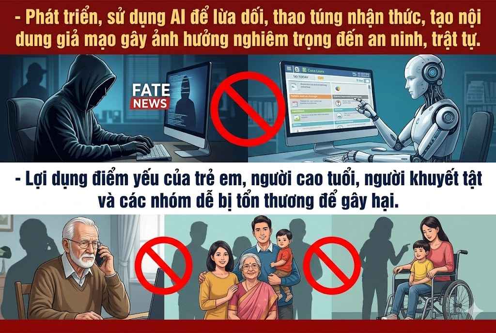 - Phát triển, sử dụng AI để lừa dối, thao túng nhận thức, tạo nội dung giả mạo gây ảnh hưởng nghiêm trọng đến an ninh, trật tự.