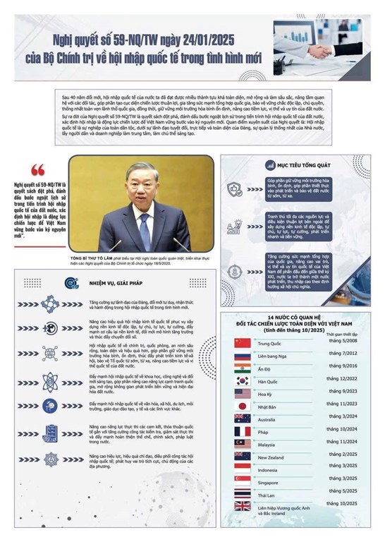 Nghị quyết số 59-NQ/TW ngày 24/1/2025 của Bộ Chính trị khóa XIII về hội nhập quốc tế - xây dựng nền kinh tế Việt Nam độc lập, tự chủ, tự lực, tự cường