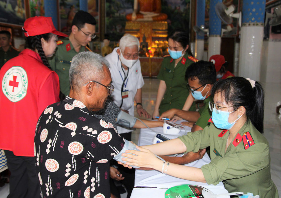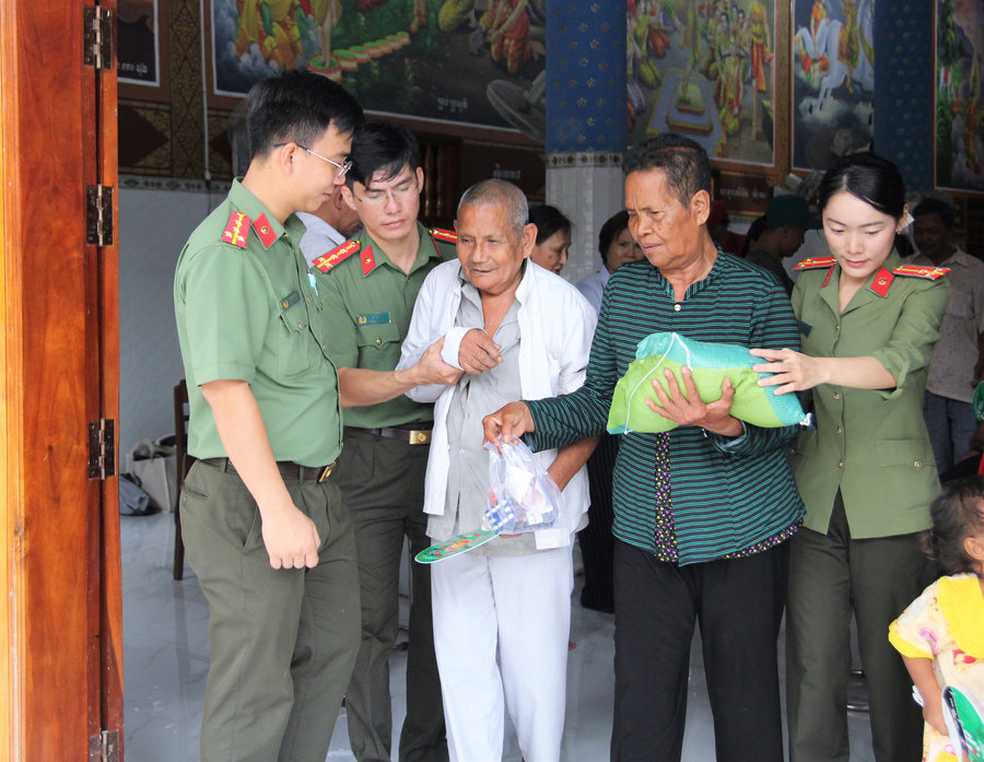 Đoàn viên Công an tỉnh hỗ trợ người dân khám bệnh và nhận quà tại chùa Phnom Pi Lơ, xã Tri Tôn