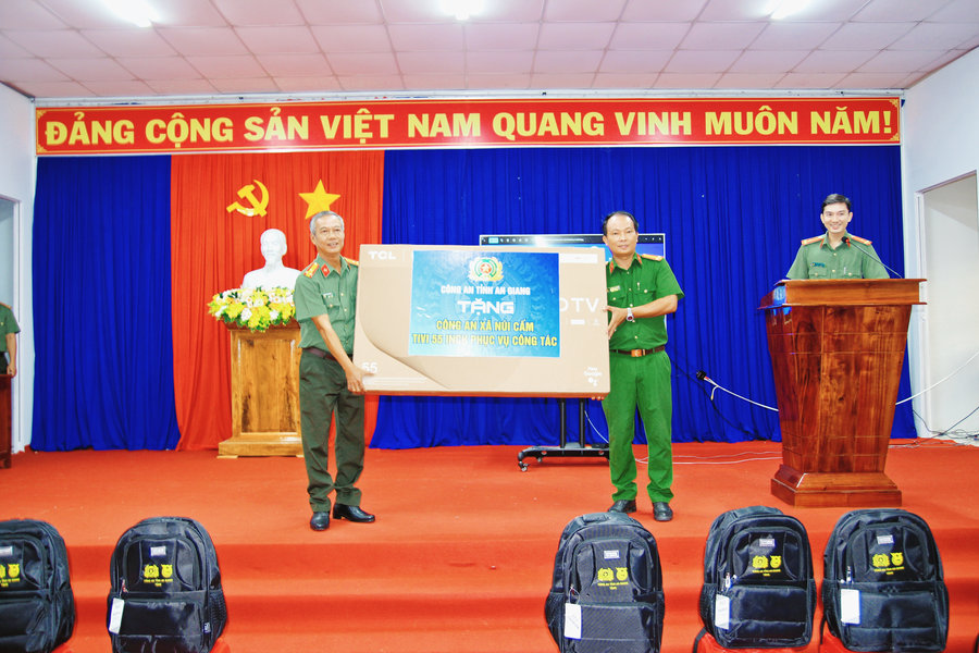 Thượng tá Kha Trường Vững, Phó Trưởng phòng Công tác chính trị trao tặng tivi cho Công an xã Núi Cấm