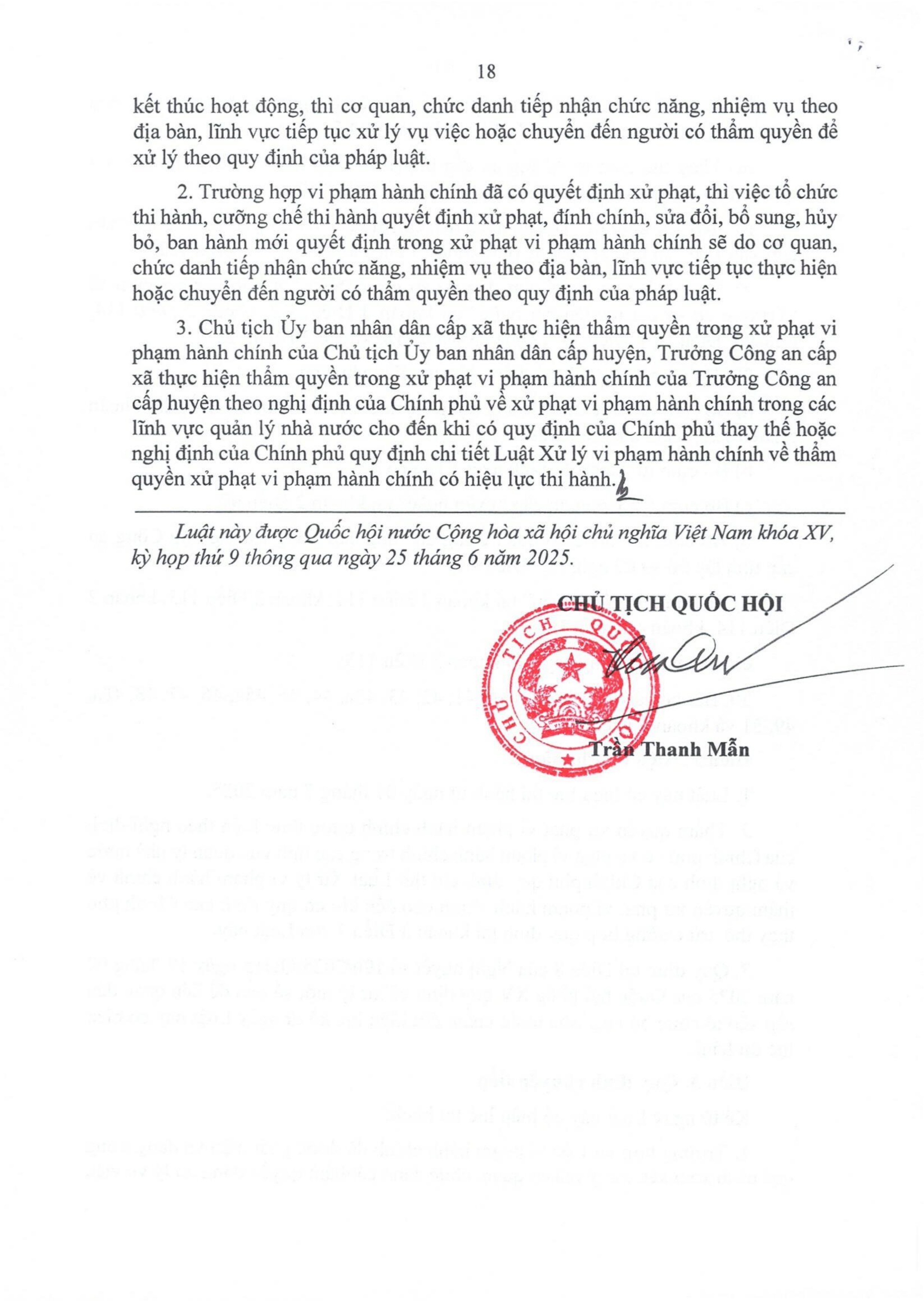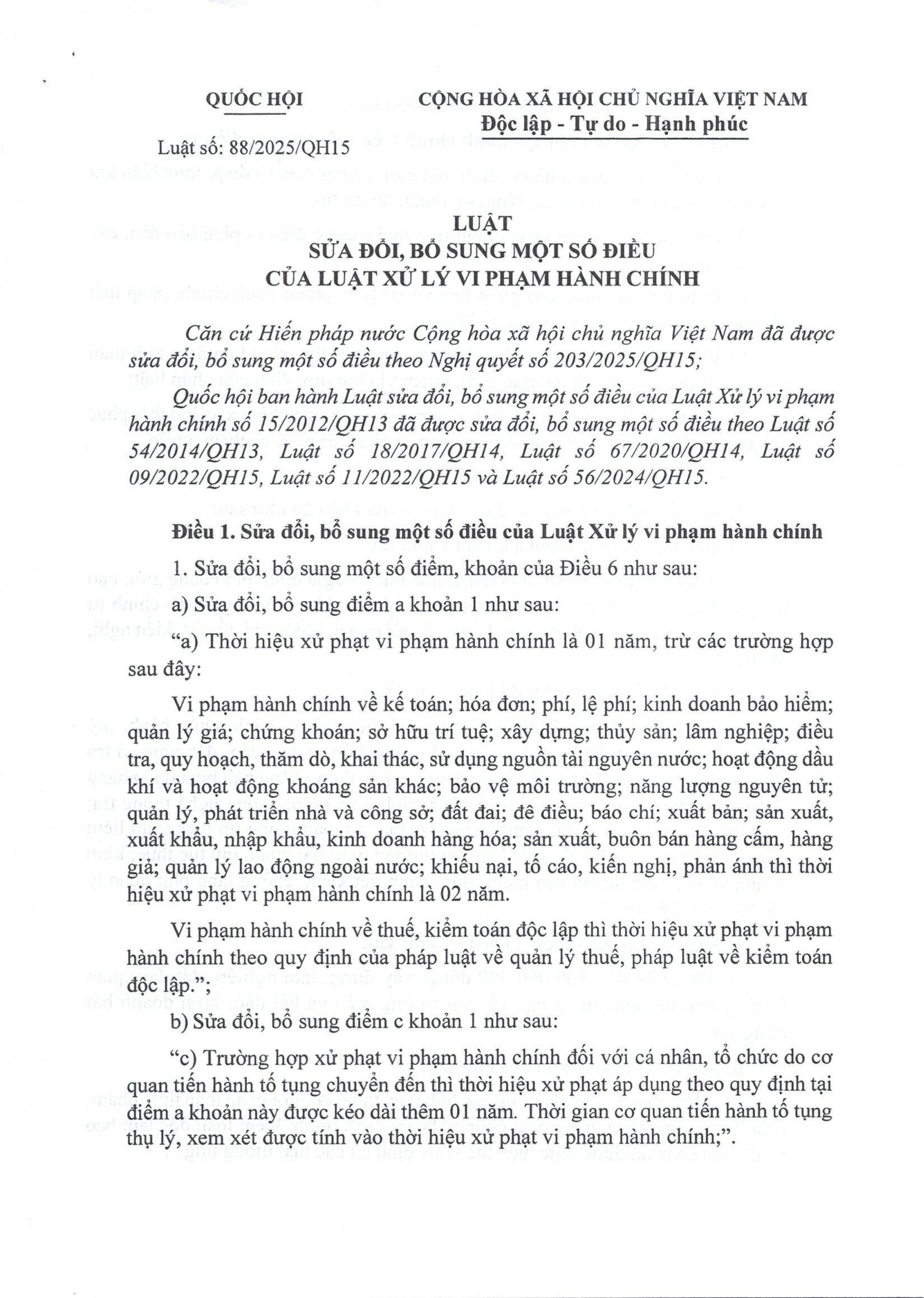 Ngày 25/6/2025, Chủ tịch Quốc hội Trần Thanh Mẫn đã ký ban hành Luật số 88/2025/QH sửa đổi, bổ sung một số điều của Luật Xử lý vi phạm hành chính năm 2012 (sửa đổi, bổ sung năm 2020).