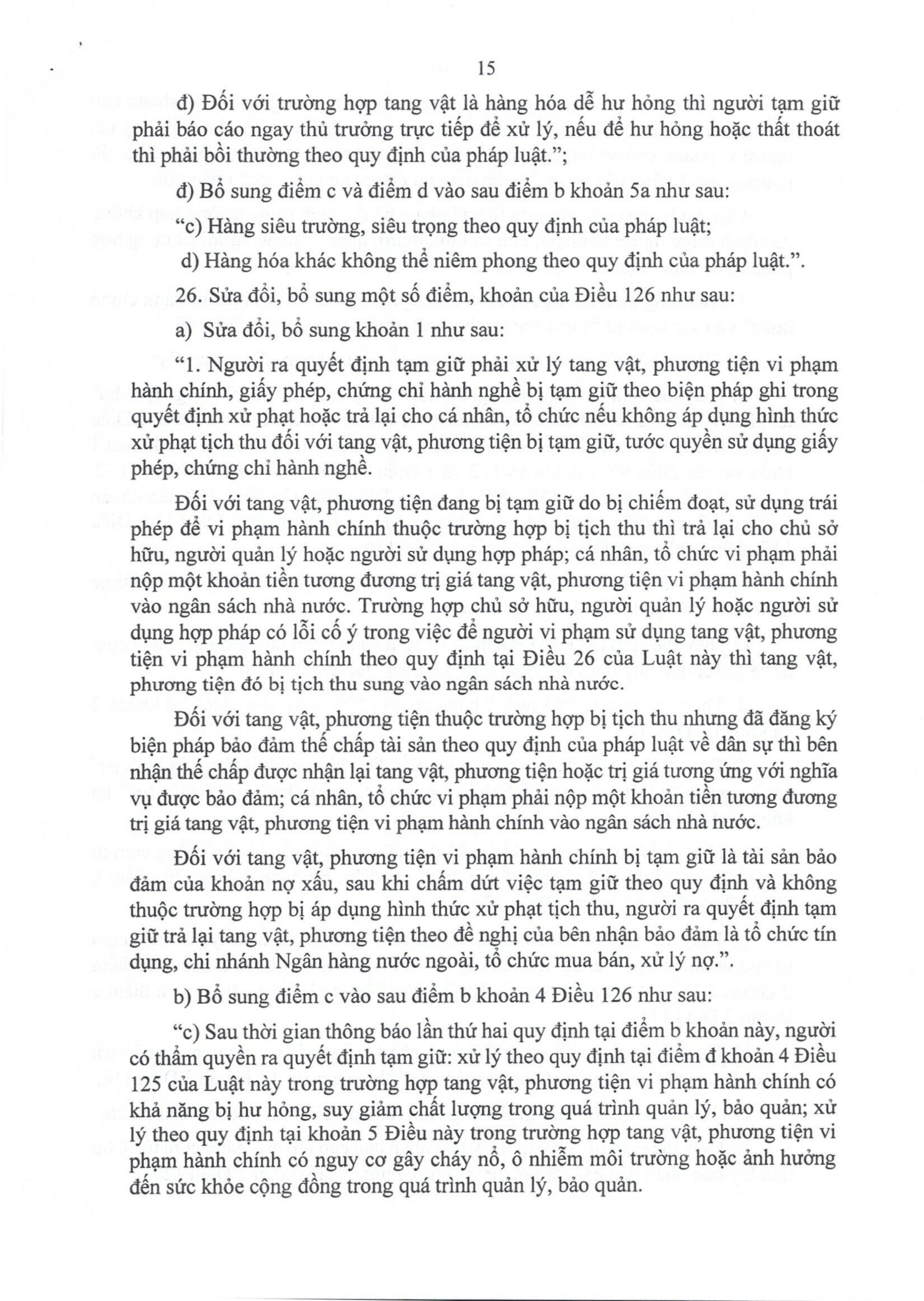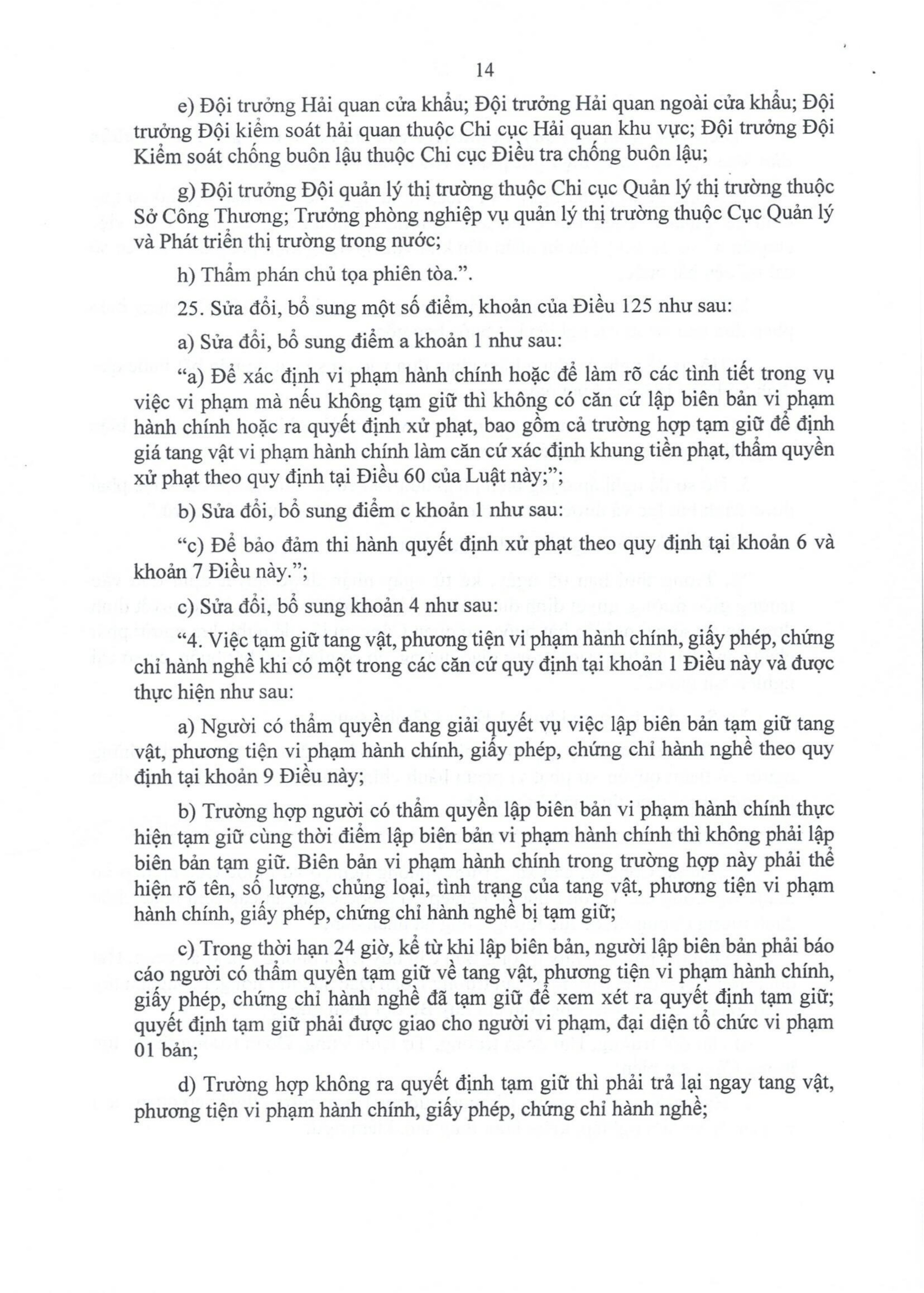 Cùng với đó, quy định về thẩm quyền lập biên bản tạm giữ cũng được sửa đổi, phù hợp với diễn biến thực tế là “người có thẩm quyền đang giải quyết vụ việc” (trước đây là “người có thẩm quyền lập biên bản vi phạm hành chính đang giải quyết vụ việc”), do trong nhiều tình huống, khi tiến hành tạm giữ chưa xác định được hành vi vi phạm thì chưa có căn cứ xác định người có thẩm quyền lập biên bản vi phạm hành chính.
