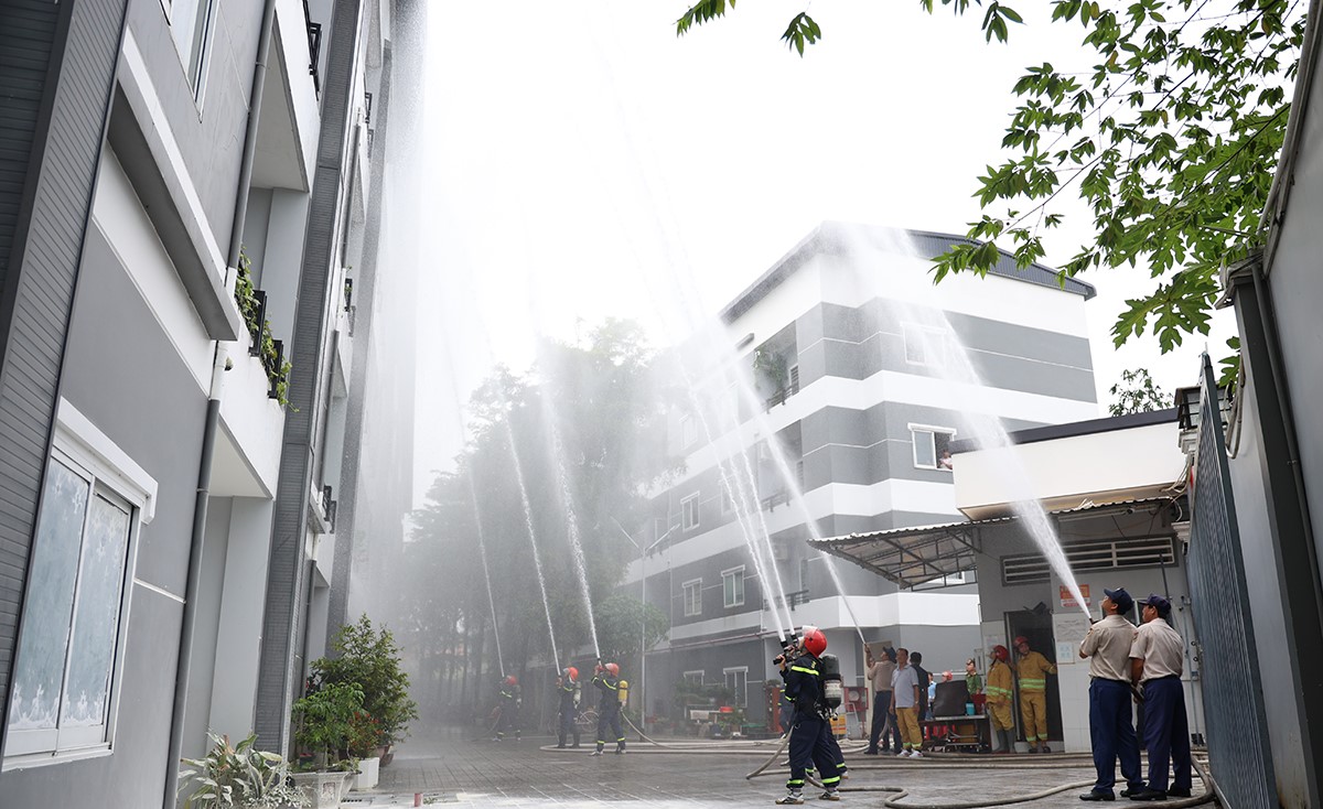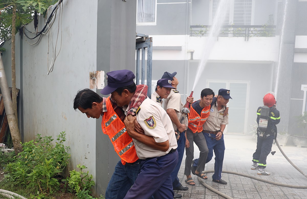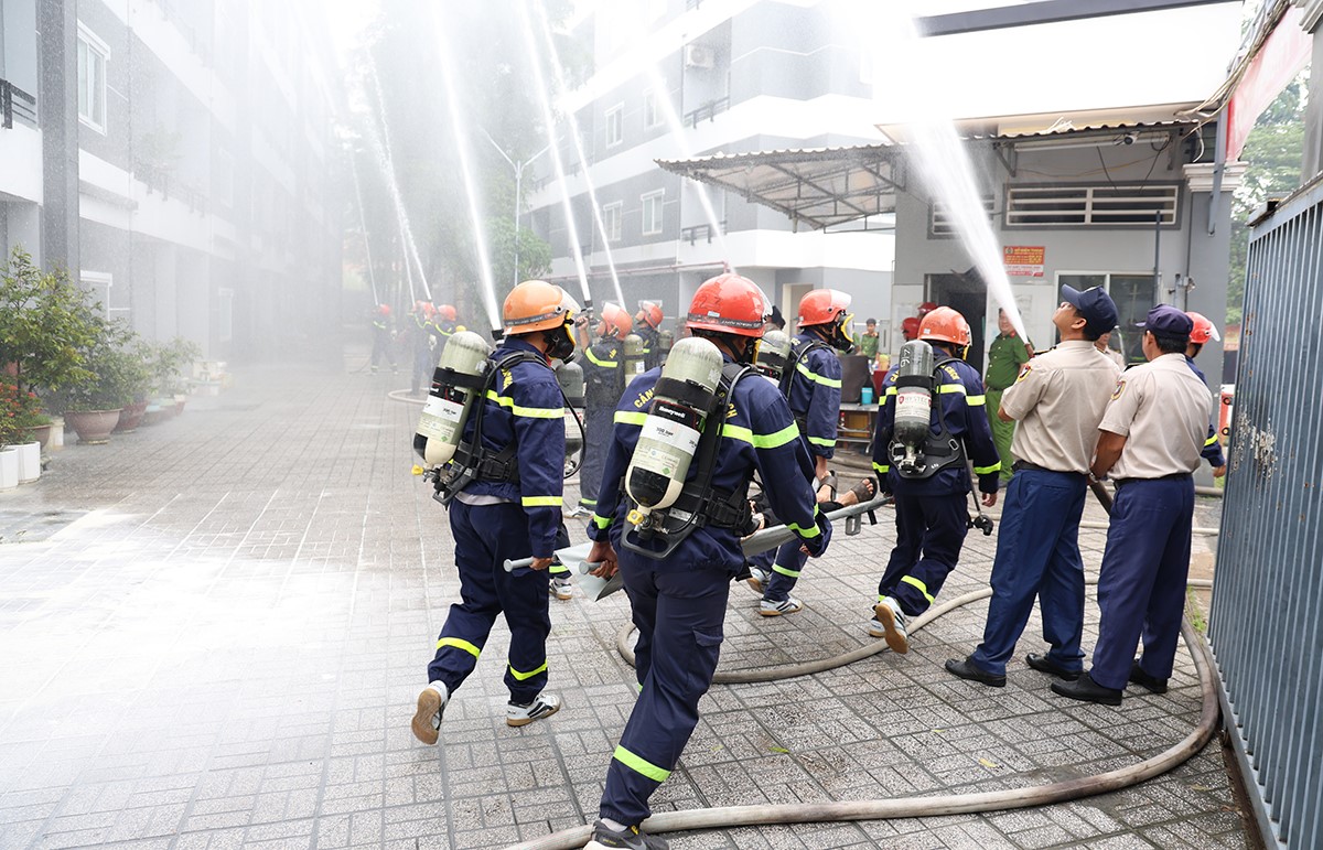 Tình huống giả định, khoảng 09 giờ, tại một phòng trong khu chung cư Đức Thành bất ngờ xảy ra sự cố cháy, nổ. Khi phát hiện cháy, bảo vệ của khu chung cư đã nhanh chóng báo động cho cư dân thoát ra ngoài và điện báo cho lực lượng chữa cháy chuyên nghiệp. Đồng thời, phối hợp với lực lượng chữa cháy tại chỗ triển khai phương án chữa cháy, hướng dẫn người dân và di dời tài sản đến nơi an toàn. Tuy nhiên, do thời tiết hanh khô, trong phòng chứa nhiều vật dụng dễ cháy nên ngọn lửa bùng phát rất nhanh và lan sang các phòng lân cận.