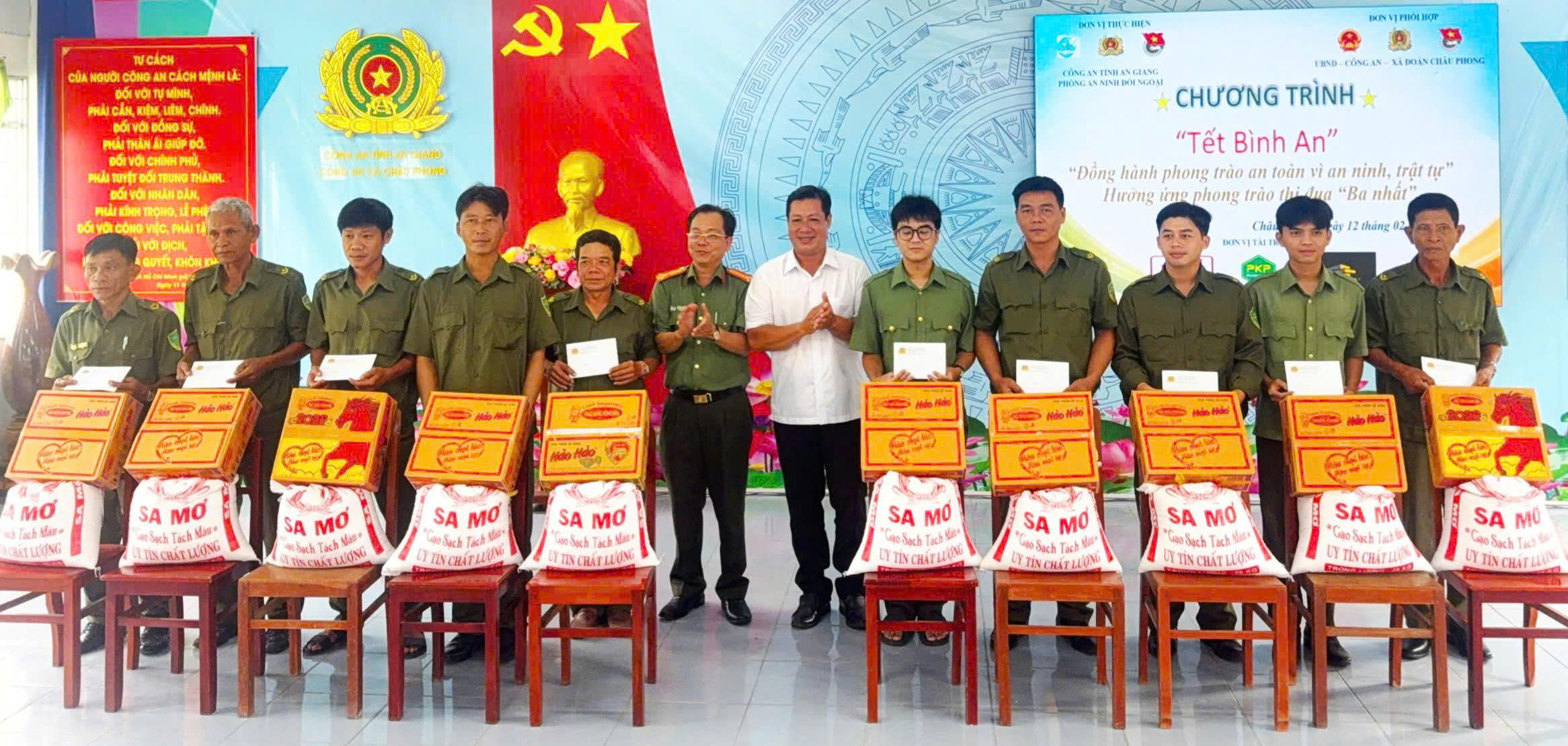 Dịp này, đơn vị cũng đã trao tặng 50 phần quà gồm 20kg gạo, 01 thùng mì và tiền mặt 200.000 đồng cho Lực lượng tham gia bảo vệ an ninh, trật tự ở cơ sở xã Châu Phong và 500kg gạo cho Lực lượng tham gia bảo vệ an ninh, trật tự ở cơ sở phường Tân Châu và Châu Phong.