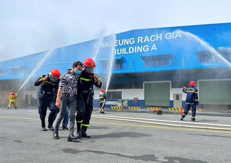 Phòng Cảnh sát PCCC và CNCH phối hợp Công ty TNHH HWA SEUNG Rạch Giá tổ chức thực tập phương án chữa cháy và cứu nạn, cứu hộ