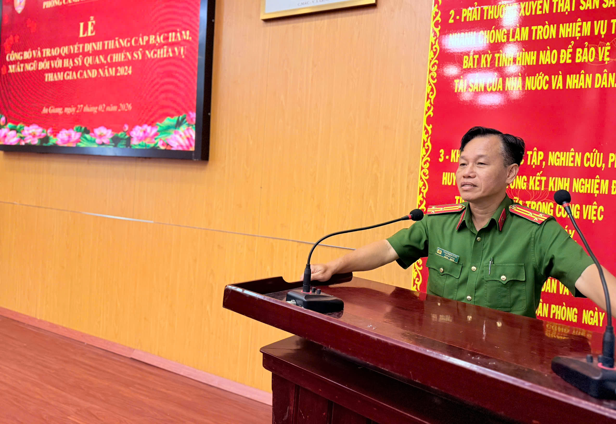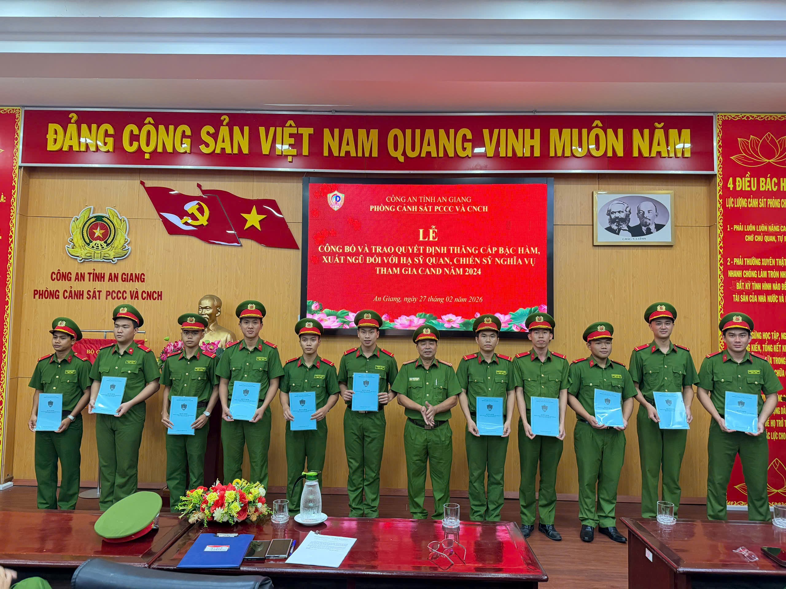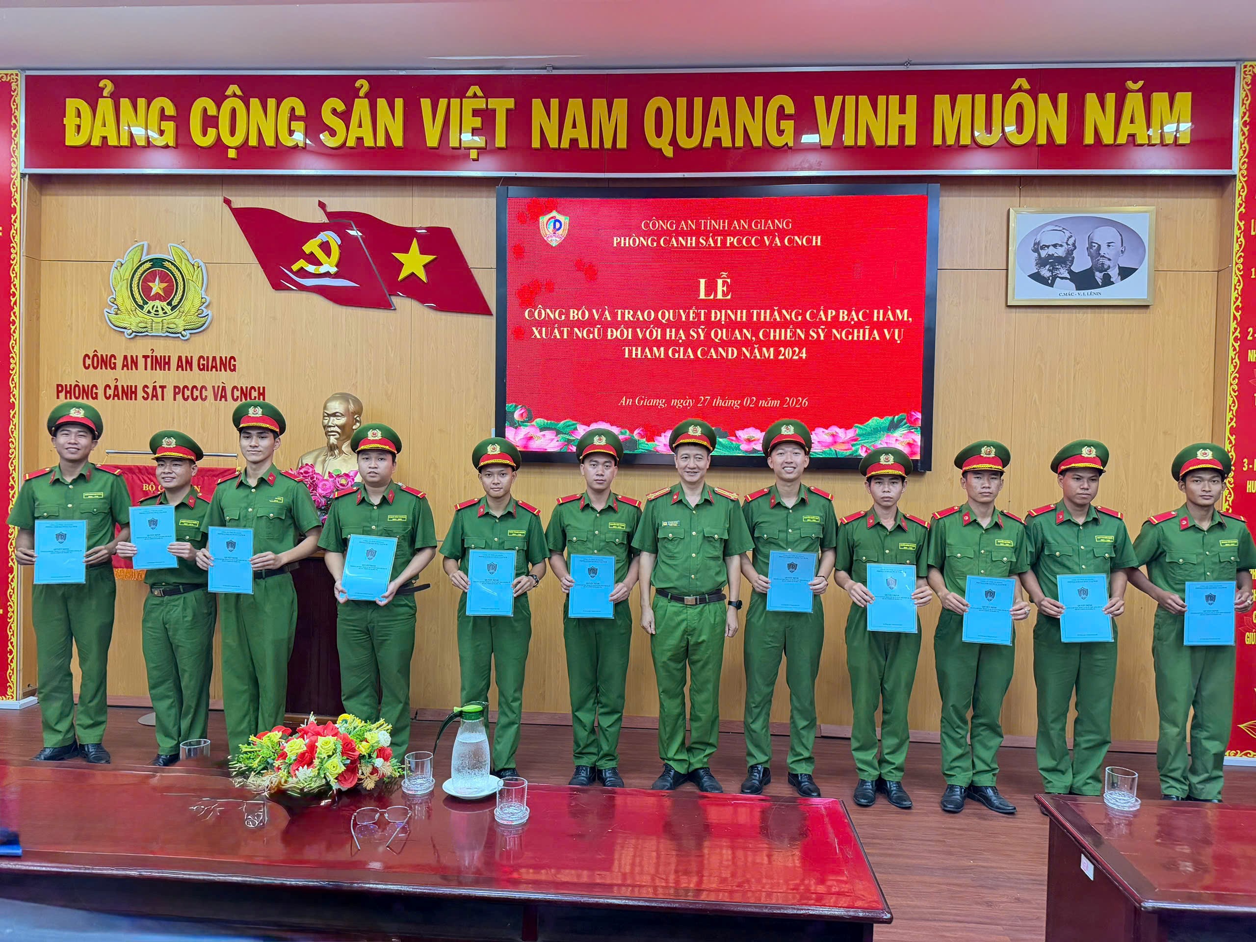 Ngày 27/02/2026, Phòng Cảnh sát PCCC và CNCH, Công an tỉnh An Giang tổ chức Lễ công bố Quyết định xuất ngũ đối với hạ sĩ quan, chiến sĩ nghĩa vụ tham gia Công an nhân dân năm 2024, đã hoàn thành nghĩa vụ phục vụ có thời hạn trong lực lượng.