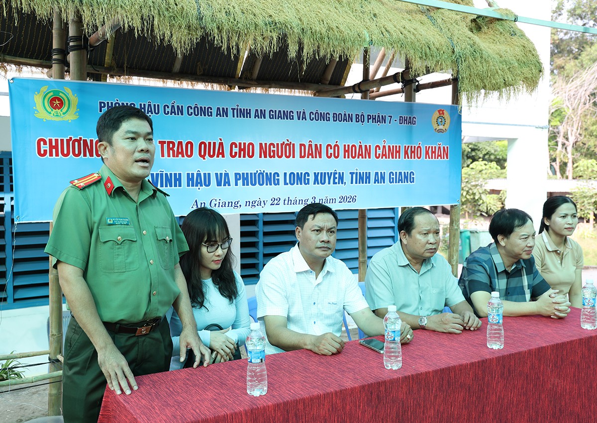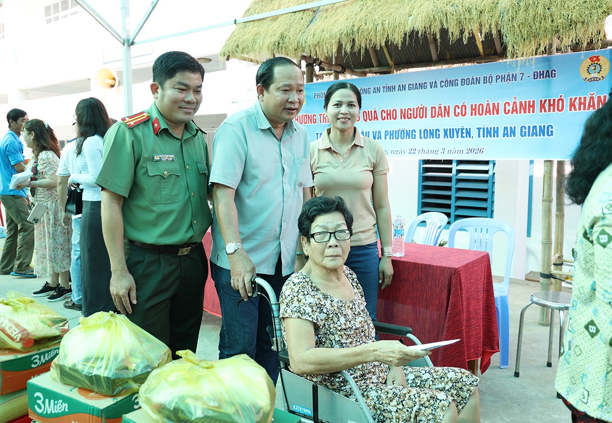 ‎Nhằm cụ thể hoá phong trào thi đua 3 nhất do Bộ Công an và Công an tỉnh An Giang phát động; chào mừng kỷ niệm 95 năm Ngày thành lập Đoàn TNCS Hồ Chí Minh (26/3/1931-26/3/2026); 51 năm Ngày giải phóng miền Nam thống nhất đất nước (30/4/1975 – 30/4/2026) và 140 năm Ngày quốc tế lao động (1/5/1886 – 1/5/2026), ngày 22/3/2026, Phòng Hậu Cần Công an tỉnh phối hợp Công đoàn bộ phận 7 - Đại học An Giang và các nhà hảo tâm tổ chức đến thăm hỏi, trao tặng 200 phần quà cho người dân có hoàn cảnh khó khăn trên địa bàn ấp Vĩnh Nghĩa, xã Vĩnh Hậu và khóm Tây Khánh 2, phường Long Xuyên, tỉnh An Giang.