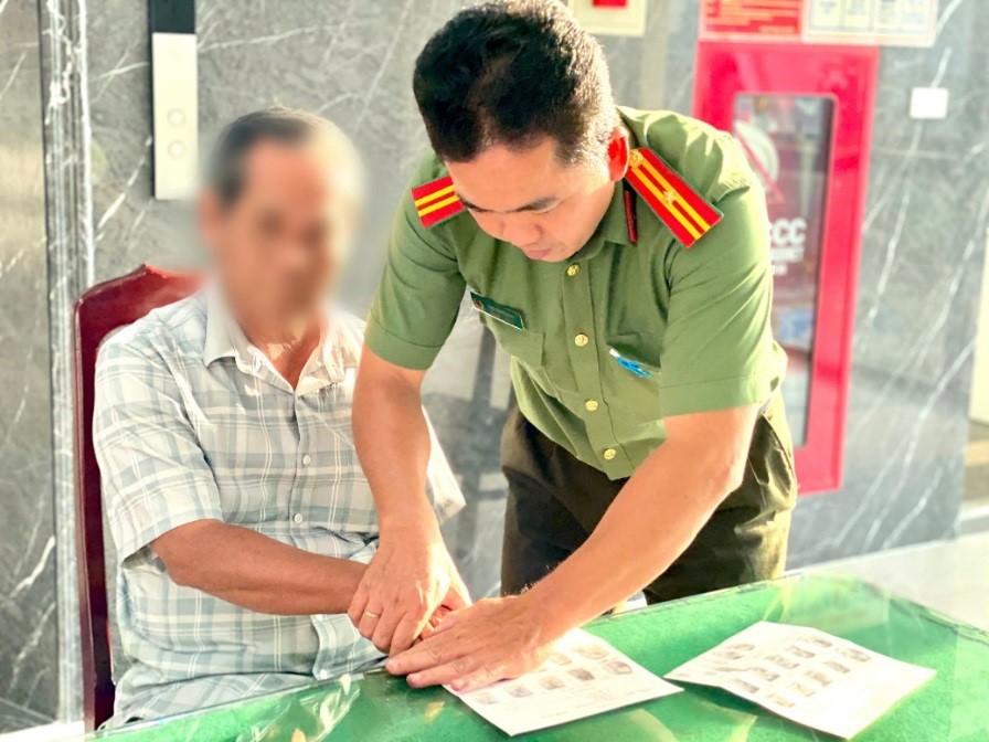 Cán bộ thực hiện quy trình thu nhận dấu vân tay đối tượng