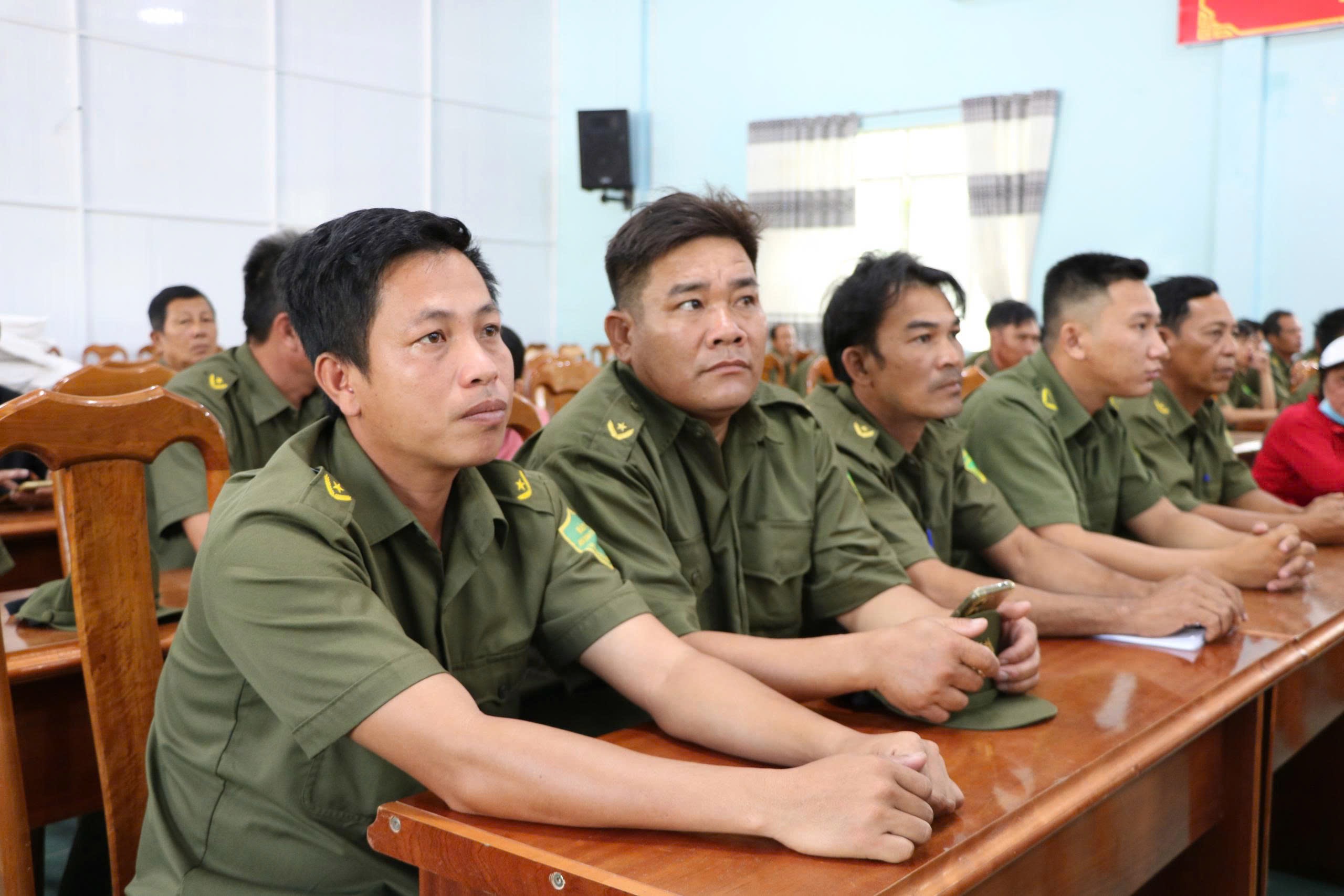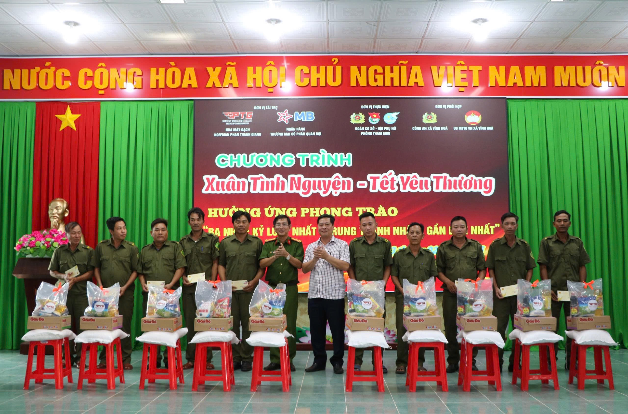 Đồng chí Đại tá Trần Văn Cung và đồng chí Lại An Nhân, Chủ tịch UBND xã Vĩnh Hoà trao tặng quà Tếtcho lực lượng tham gia bảo vệ ANTT ở cơ sở