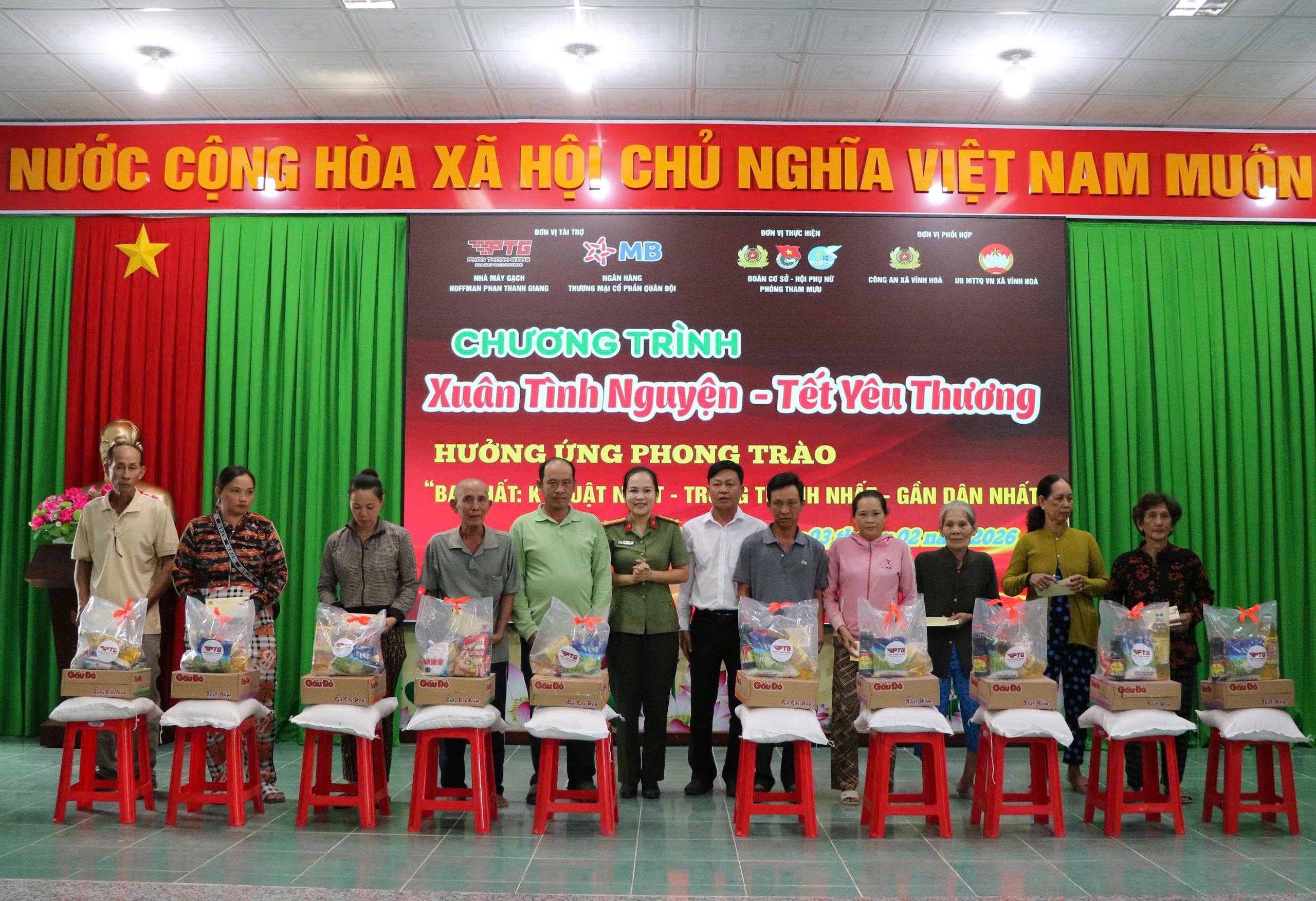 Hưởng ứng phong trào thi đua “Cả nước chung tay vì người nghèo – không để ai bị bỏ lại phía sau” và phong trào thi đua 03 nhất “Kỷ luật nhất – Trung thành nhất – Gần dân nhất”, nhân dịp Tết Nguyên đán Bính Ngọ năm 2026, Phòng Tham mưu Công an tỉnh An Giang phối hợp với mạnh thường quân Nhà máy gạch Hoffman Phan Thanh Giang và UBND xã Vĩnh Hòa tổ chức Chương trình trao quà Tết cho các hộ gia đình chính sách, hộ nghèo có hoàn cảnh khó khăn và lực lượng tham gia bảo vệ an ninh, trật tự ở cơ sở trên địa bàn xã Vĩnh Hòa. ‎