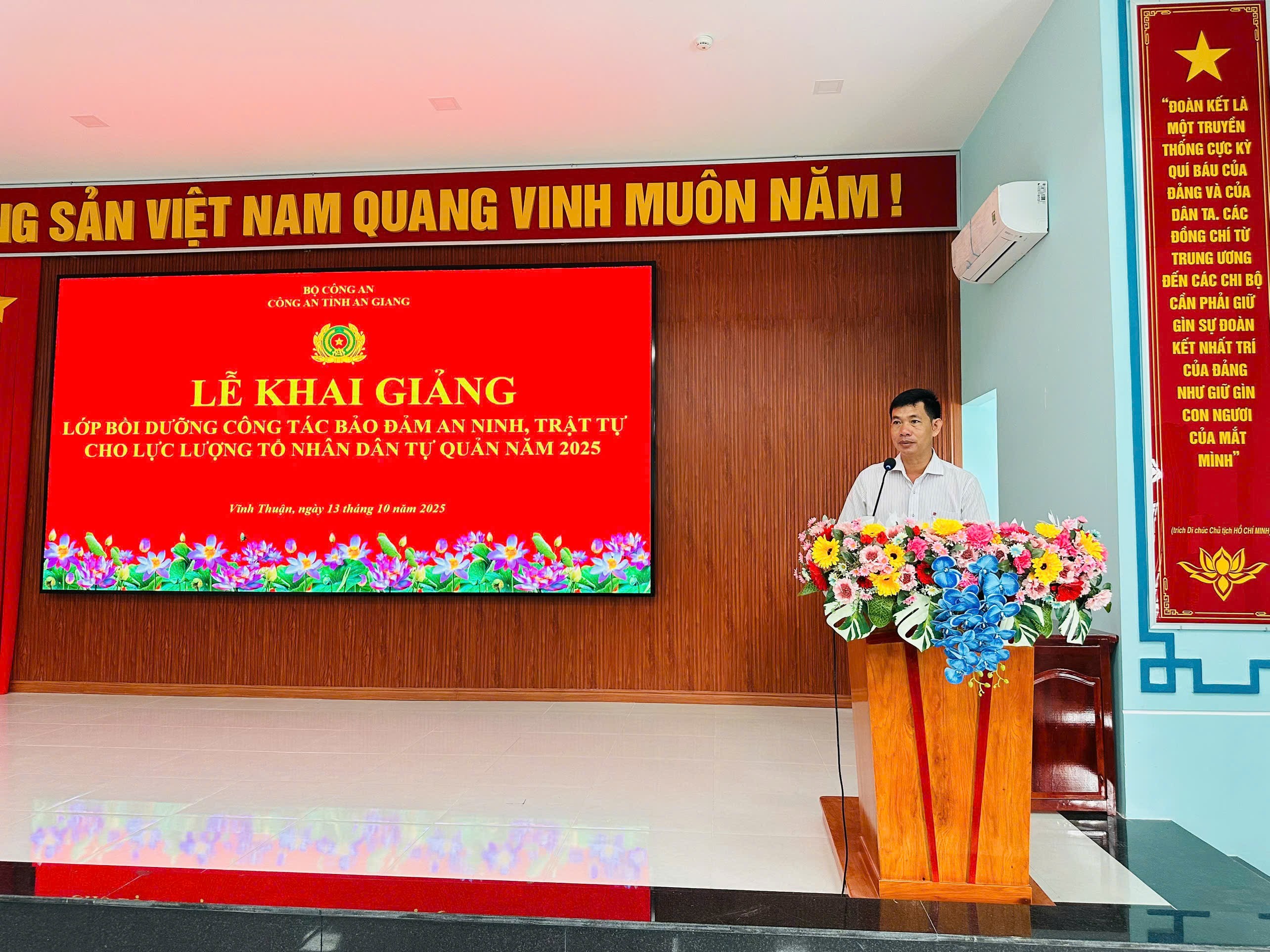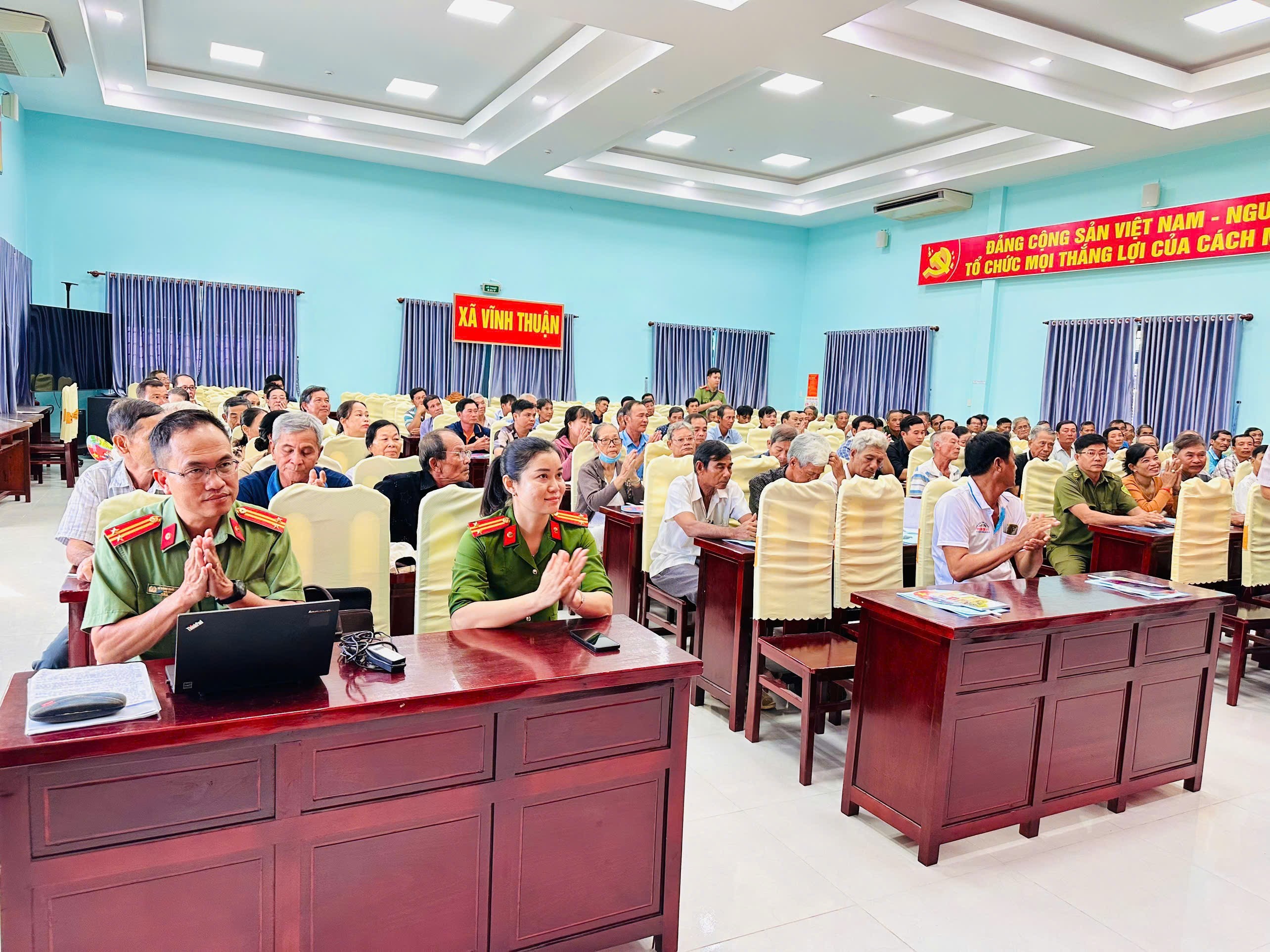 Sáng ngày 13/10, Phòng Tham mưu Công an tỉnh phối hợp với Ủy ban nhân dân xã Vĩnh Thuận mở lớp tuyên truyền, bồi dưỡng công tác đảm bảo an ninh, trật tự cho lực lượng Tổ nhân dân tự quản có 114 lượt người là thành viên các Tổ nhân dân tự quản trên địa bàn xã tham dự.