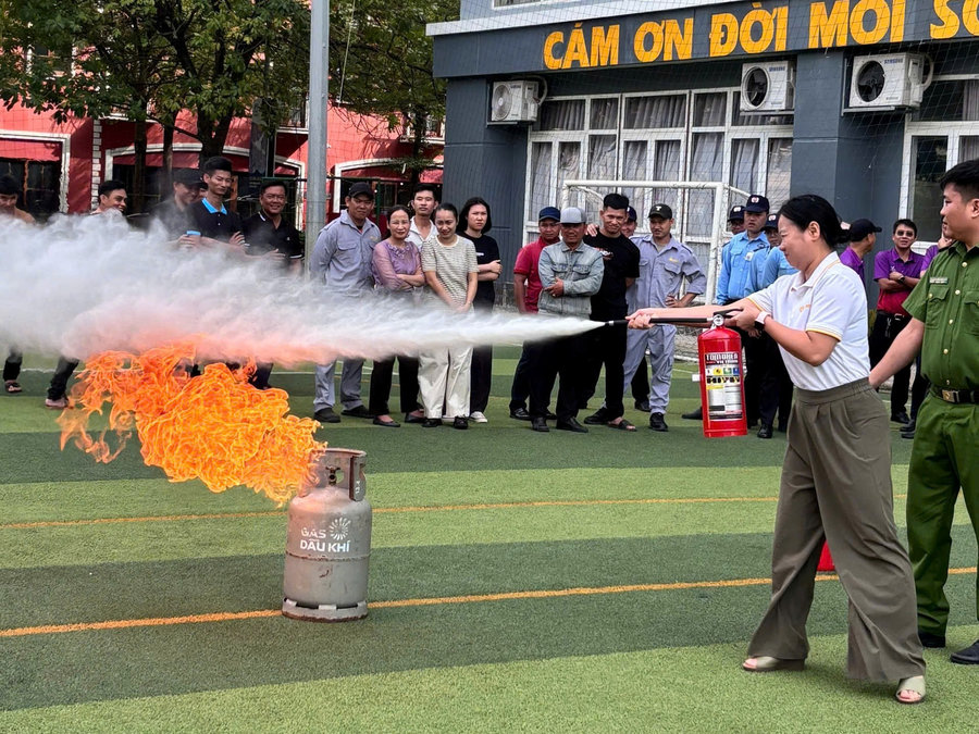 Học viên thực hành sử dụng bình chữa cháy xách tay dập lửa khi bình gas đang cháy