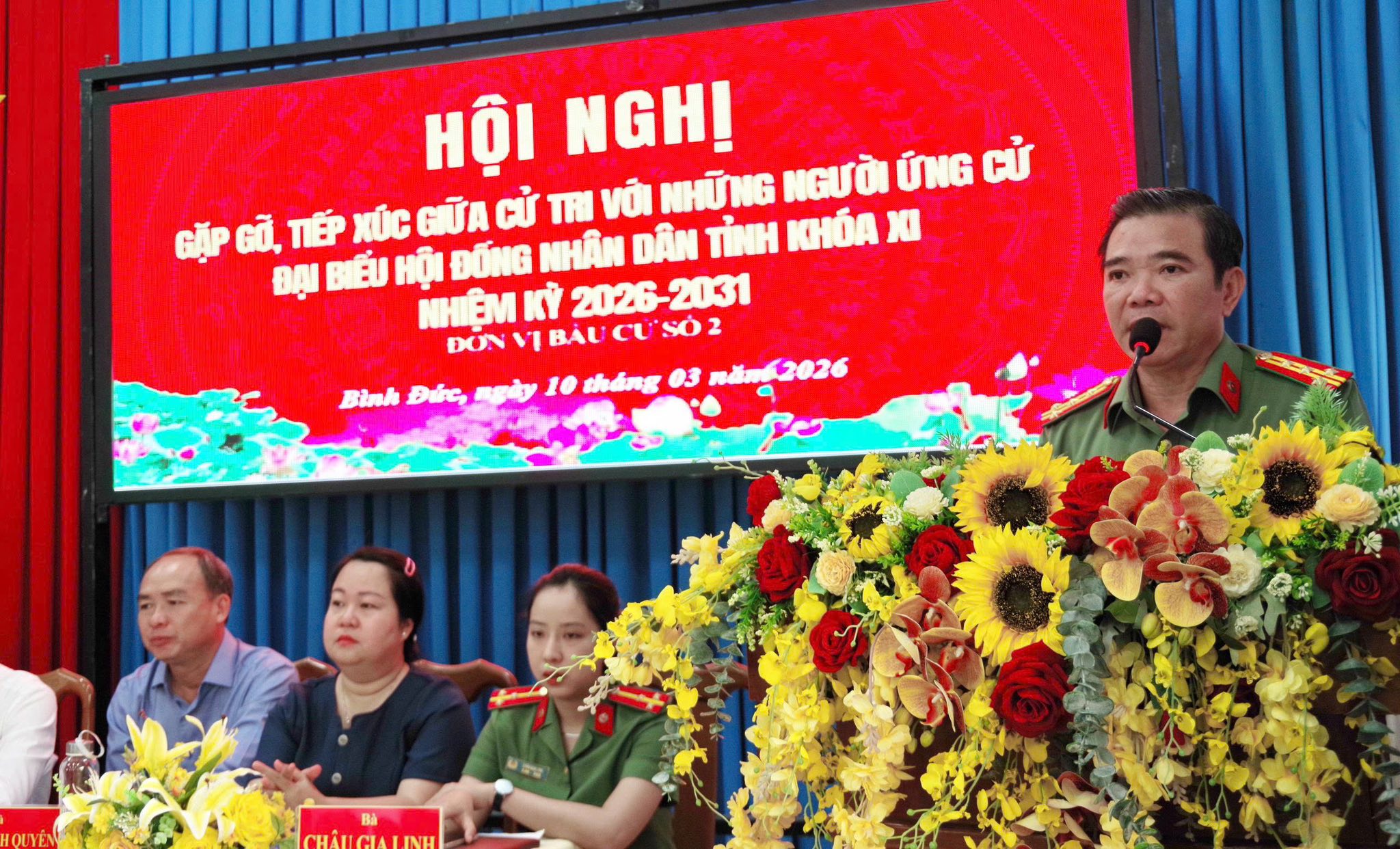 Phát biểu tại buổi tiếp xúc, Đại tá Lê Văn Quý khẳng định, nếu được cử tri tín nhiệm bầu vào Hội đồng nhân dân tỉnh khóa XI, nhiệm kỳ 2026 – 2031, đồng chí sẽ tiếp tục phát huy bản lĩnh, trách nhiệm, tận tụy phục vụ Nhân dân, lắng nghe và phản ánh trung thực ý kiến, nguyện vọng của cử tri, góp phần giữ vững an ninh trật tự, phục vụ sự phát triển bền vững của tỉnh An Giang.