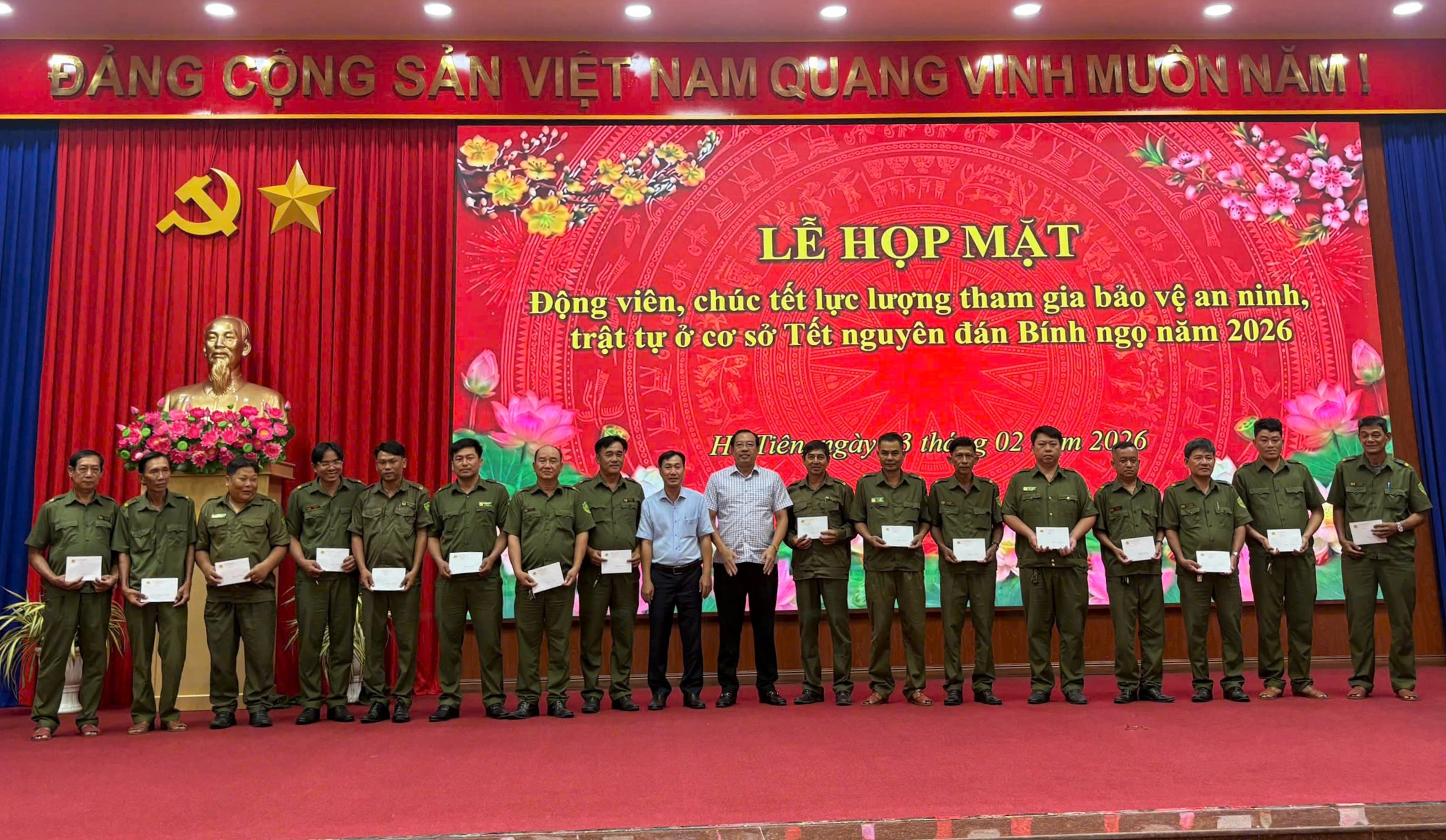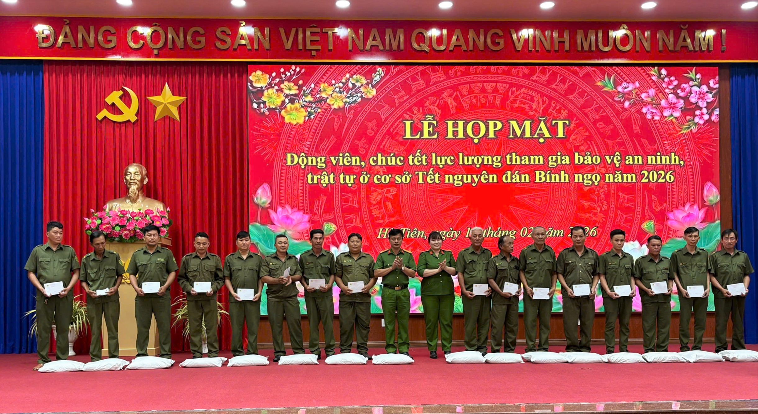Ngày 13/02/2026, Đảng ủy, UBND và Ban Chỉ huy Công an phường Hà Tiên tổ chức họp mặt, tặng quà và chúc Tết lực lượng tham gia bảo vệ an ninh, trật tự ở cơ sở nhân dịp Tết Nguyên đán Bính Ngọ 2026. Đây là hoạt động thường niên, thể hiện sự quan tâm của cấp ủy, chính quyền địa phương đối với lực lượng nòng cốt trong công tác giữ gìn an ninh, trật tự tại cơ sở.
