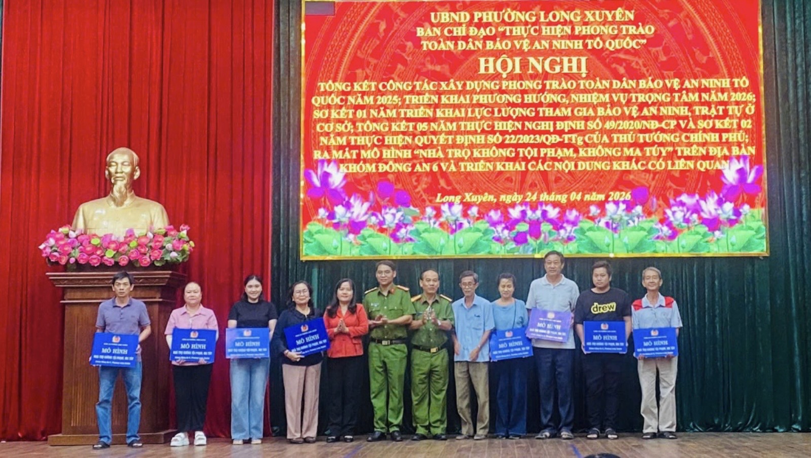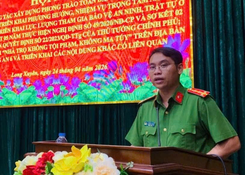 ‎Công an phường Long Xuyên vừa tham mưu Đảng ủy, UBND phường đã tổ chức Hội nghị tổng kết công tác xây dựng phong trào toàn dân bảo vệ an ninh Tổ quốc (ANTQ) năm 2025, triển khai phương hướng, nhiệm vụ năm 2026; đồng thời sơ kết 01 năm triển khai lực lượng tham gia bảo vệ an ninh, trật tự (ANTT) ở cơ sở; tổng kết 05 năm thực hiện Nghị định số 49/2020/NĐ-CP của Chính phủ và sơ kết 02 năm thực hiện Quyết định số 22/2023/QĐ-TTg của Thủ tướng Chính phủ.
