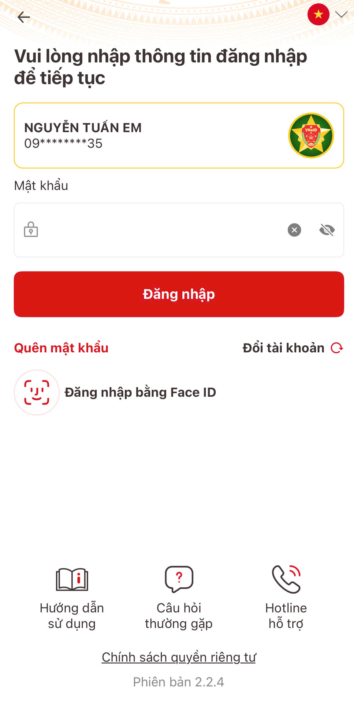 - Bước 1: Truy cập ứng dụng VNeID trên thiết bị di động thông minh, đăng nhập bằng số định danh cá nhân và mật khẩu đã thiết lập.
