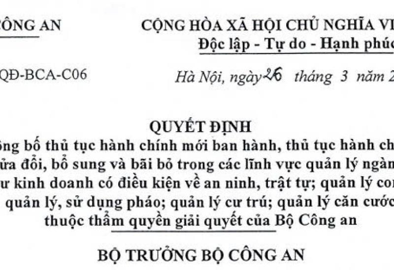 Ngày 26/03/2026, Bộ trưởng Bộ Công an ký Quyết định 1523/QĐ-BCA-C06 về việc công bố thủ tục hành chính mới ban hành, thủ tục hành chính được sửa đổi, bổ sung và bãi bỏ trong các lĩnh vực quản lý ngành, nghề đầu tư kinh doanh có điều kiện về an ninh, trật tự; quản lý con dấu; quản lý, sử dụng pháo; quản lý cư trú; quản lý căn cước thuộc thẩm quyền giải quyết của Bộ Công an