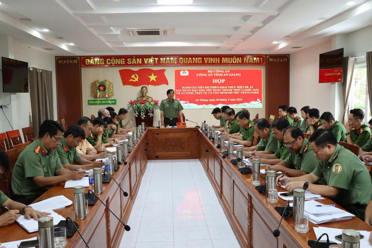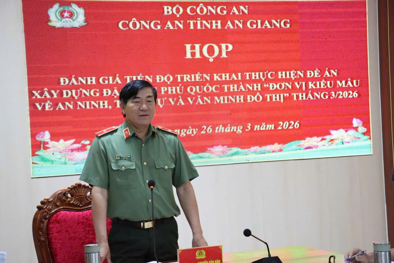 ‎Ngày 26/3/2026, tại Công an đặc khu Phú Quốc. Công an tỉnh An Giang tổ chức hội nghị đánh giá kết quả thực hiện Đề án xây dựng đặc khu Phú Quốc thành “Đơn vị kiểu mẫu về an ninh, trật tự và văn minh đô thị” tháng 3/2026. Đồng chí Thiếu tướng Nguyễn Văn Hận, Ủy viên Ban thường vụ Tỉnh ủy, Giám đốc Công an tỉnh dự và chủ trì hội nghị.