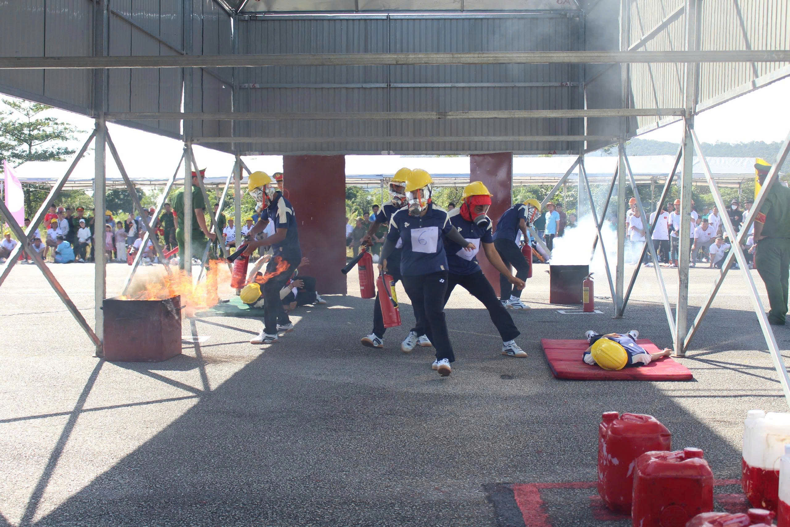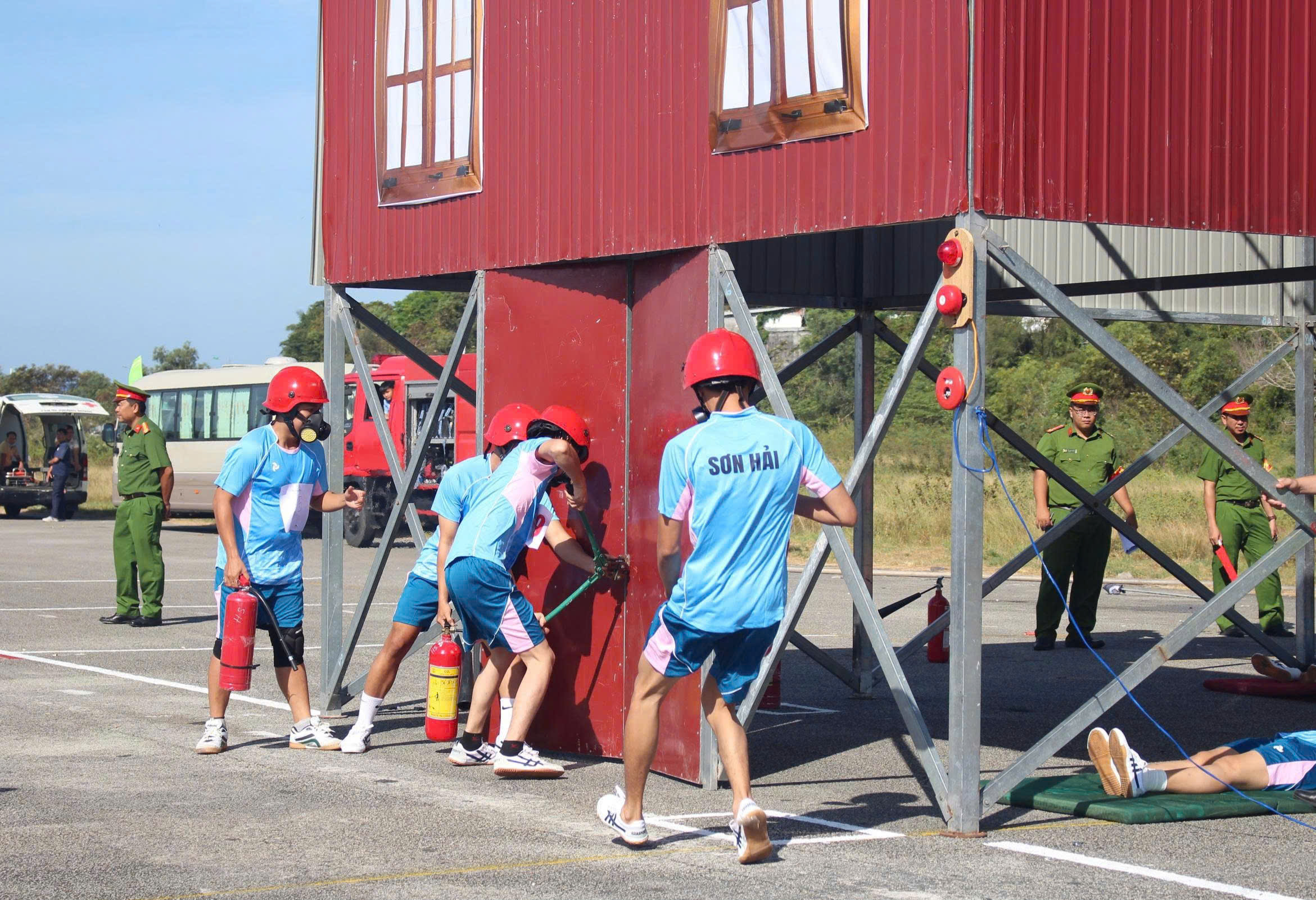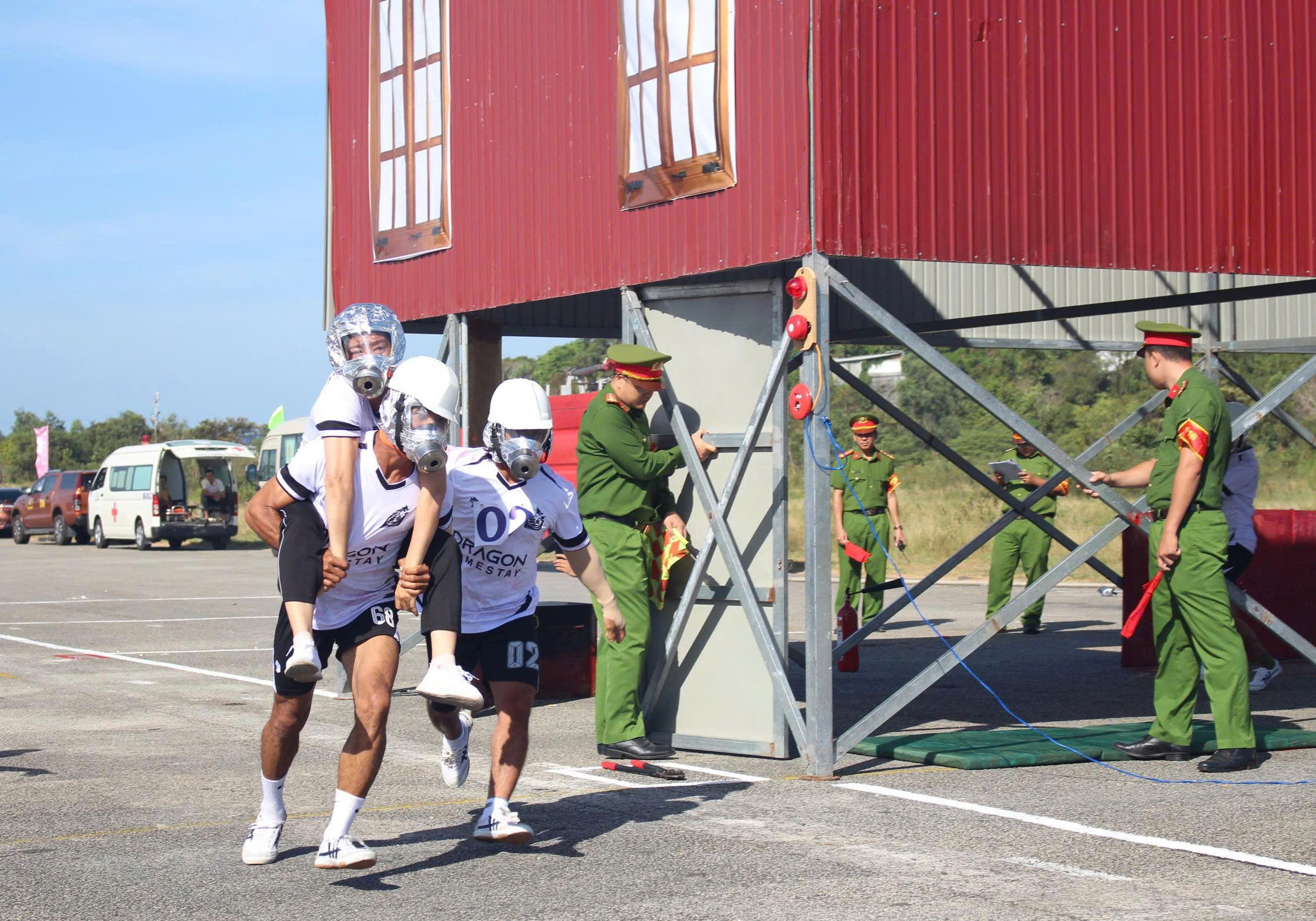 Đối với phần thi thực hành, các đội tuyển sẽ phân công nhiệm vụ cho 08 vận động viên phối hợp tham gia tình huống giả định, 2 vận động viên đóng người gặp nạn, 6 vận động viên còn lại thực hiện nhiệm vụ chạy đội hình chữa cháy, CNCH, xử lý các tình huống: Ấn chuông báo động; phá khóa cứu người bị nạn; dùng bình chữa cháy dập tắt đám cháy và di chuyển tài sản đối với loại hình nhà ở kết hợp sản xuất, kinh doanh… Nhờ được tập huấn và luyện tập kỹ lưỡng trước đó, các vận động viên tham gia với tinh thần khẩn trương, bình tĩnh và hiệp đồng chặt chẽ, tái hiện sinh động sự chủ động và chuyên nghiệp của lực lượng PCCC tại chỗ.