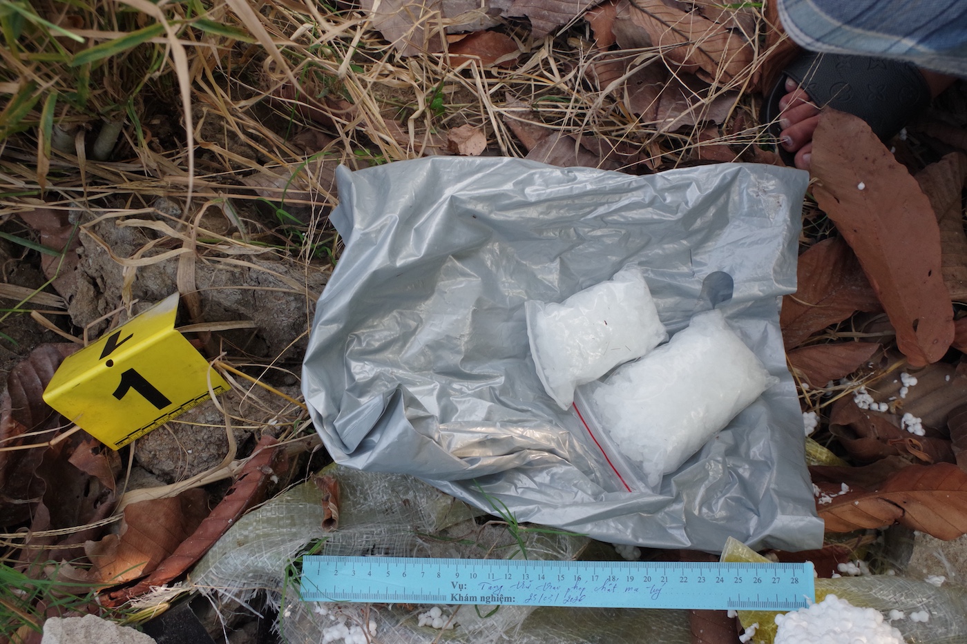 Sau khi kiểm tra và làm việc ban đầu, đối tượng Nguyễn Thanh Tòng đã thừa nhận hành vi tàng trữ trái phép chất ma túy, đồng thời tự nguyện giao nộp 01 bịch nilon màu xám dạng quai xách. Bên trong bịch nilon có 01 túi giấy màu vàng nhạt được dán kín bằng băng keo; trong túi giấy chứa 02 bịch nilon đựng các hạt tinh thể rắn màu trắng, không đồng nhất, nghi là ma túy.