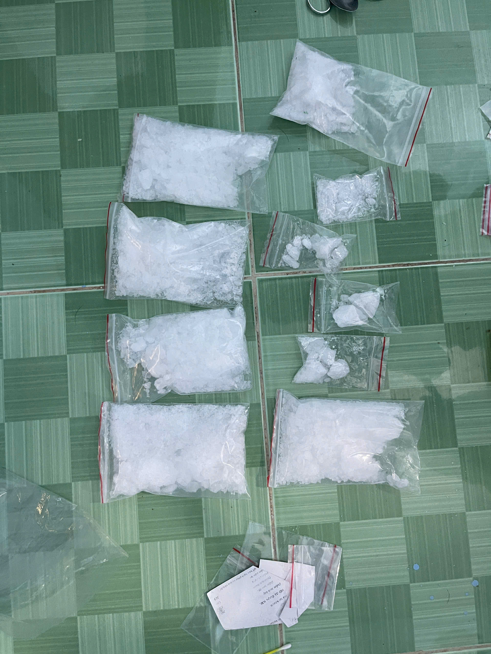 Tại hiện trường, Công an thu giữ nhiều tang vật nghi ma túy: 13 bịch nilon chứa tinh thể màu trắng trong phòng ngủ và 01 ống hút nhựa hàn kín hai đầu chứa tinh thể tương tự tại khu vực bếp.