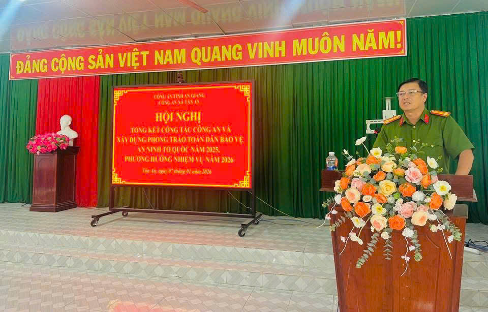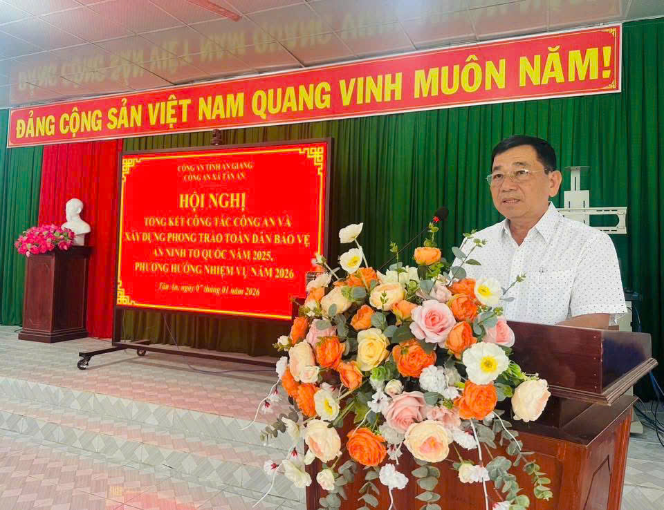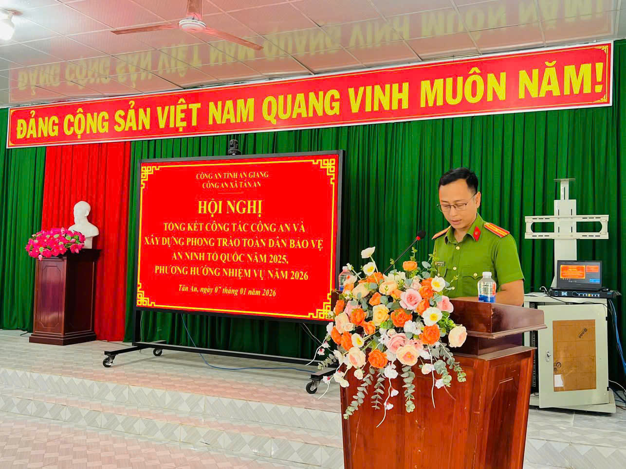 Công an xã Tân An vừa tổ chức Hội nghị tổng kết công tác Công an năm 2025 và triển khai phương hướng, nhiệm vụ công tác năm 2026. Đến dự và chỉ đạo Hội nghị có đồng chí Thượng tá Đặng Văn Thinh, Phó Thủ trưởng Cơ quan Cảnh sát điều tra Công an tỉnh. Về phía lãnh đạo địa phương có đồng chí La Hồng Phong, Bí thư Đảng ủy, Chủ tịch HĐND xã; đồng chí Đỗ Văn Leo, Phó Bí thư Đảng ủy, Chủ tịch UBND xã. Tham dự Hội nghị còn có Ban lãnh đạo Công an xã, cán bộ chiến sĩ, lực lượng bảo đảm an ninh trật tự ở cơ sở; đại diện các trường học, ban, ngành, đoàn thể xã và Ban Nhân dân 17 ấp.