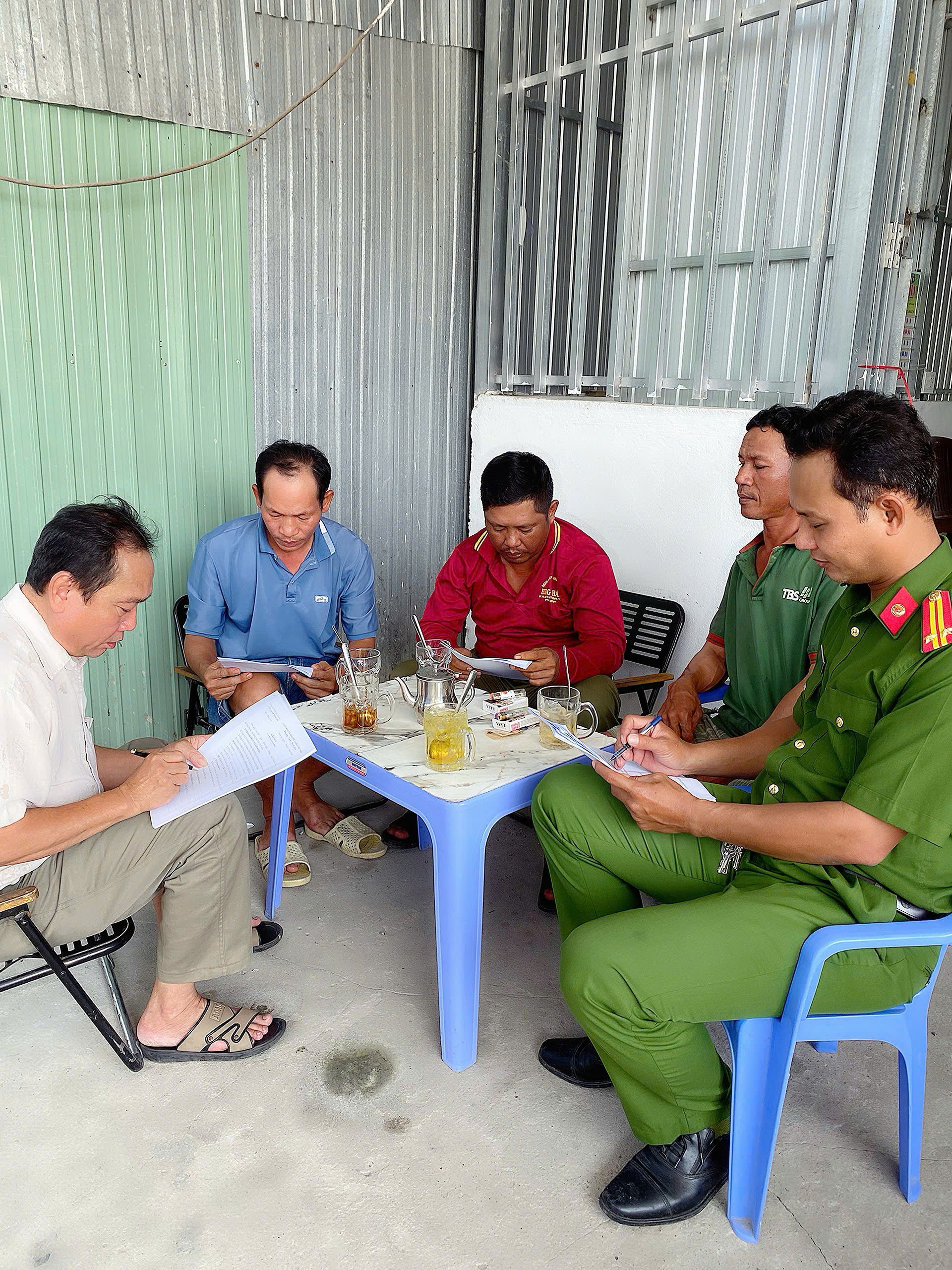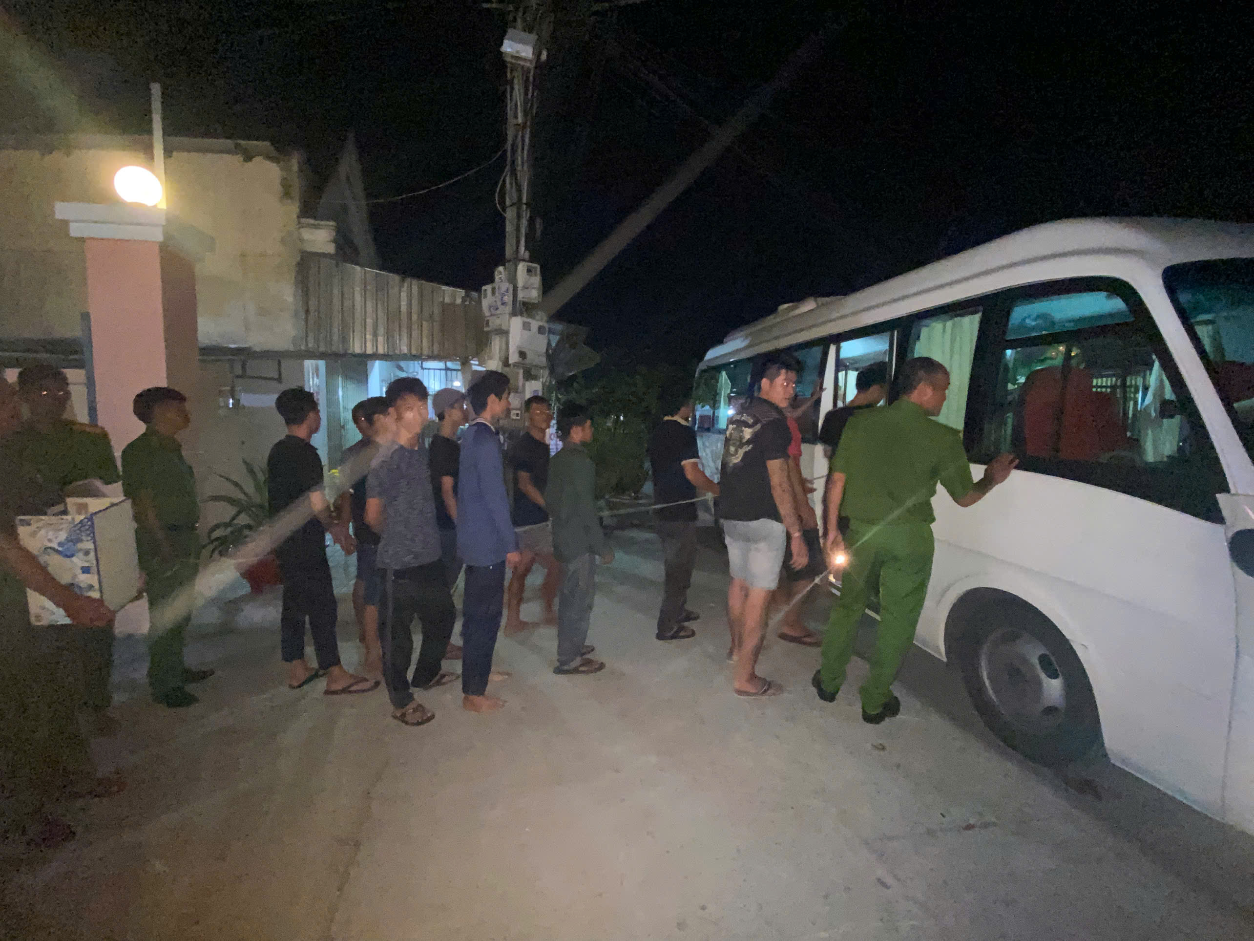 Lực lượng Công an xã Bình An đưa các đối tượng về trụ sở làm việc