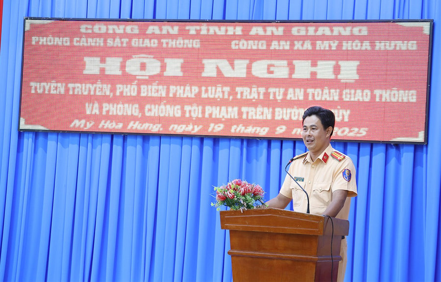 Sáng 19/9/2025, Phòng Cảnh sát giao thông Công an tỉnh An Giang phối hợp Công an xã Mỹ Hoà Hưng tổ chức buổi tuyên truyền, phổ biến pháp luật về trật tự an toàn giao thông và phòng, chống tội phạm trên đường thuỷ nội địa cho cán bộ, công nhân viên chức và Nhân dân xã Mỹ Hoà Hưng.