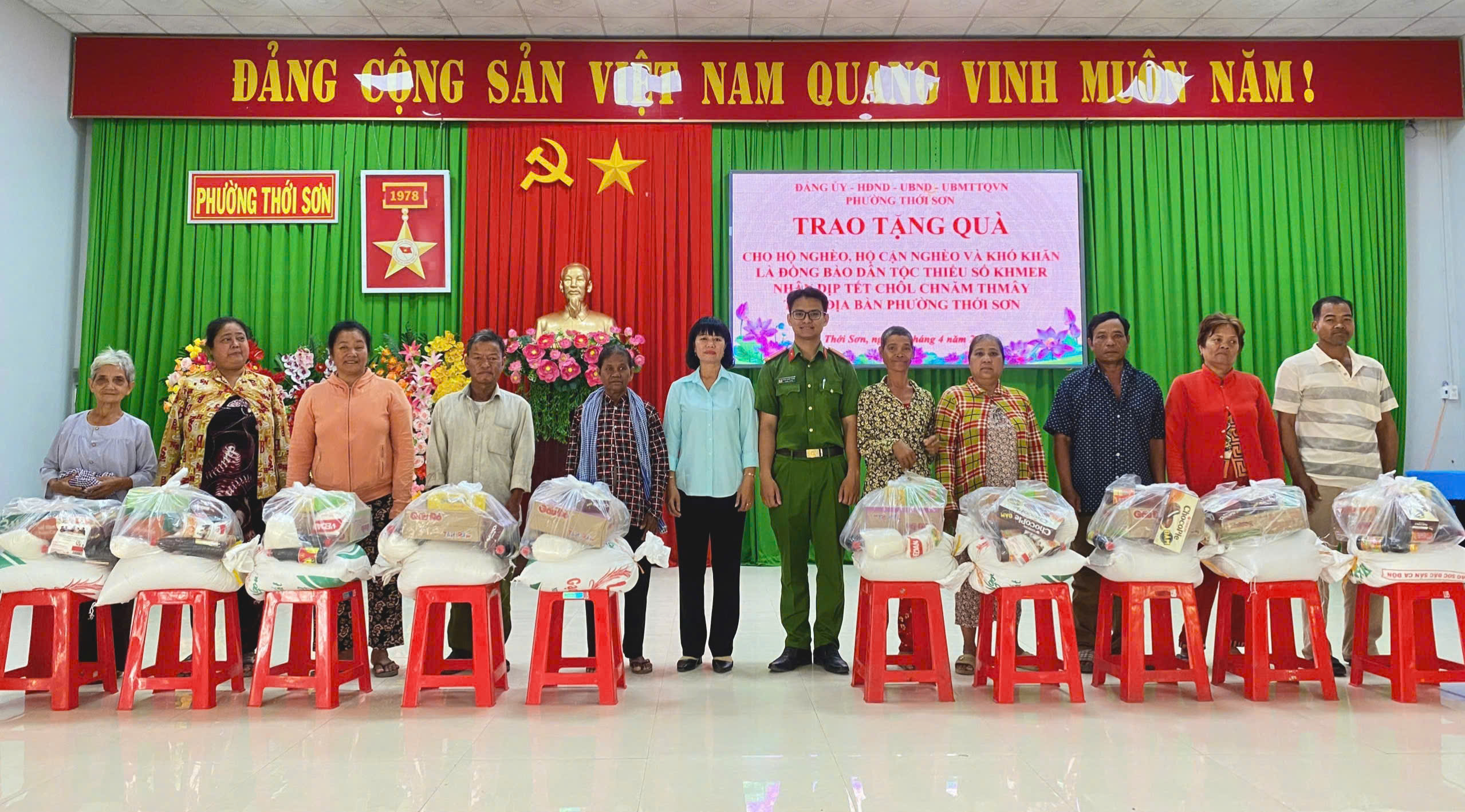 Nhân dịp Tết cổ truyền Chol Chnam Thmay của đồng bào dân tộc Khmer, Công an phường Thới Sơn phối hợp với Uỷ ban Mặt trận Tổ quốc Việt Nam phường tổ chức buổi tuyên truyền, tặng quà cho bà con đồng bào dân tộc Khmer có hoàn cảnh khó khăn trên địa bàn.