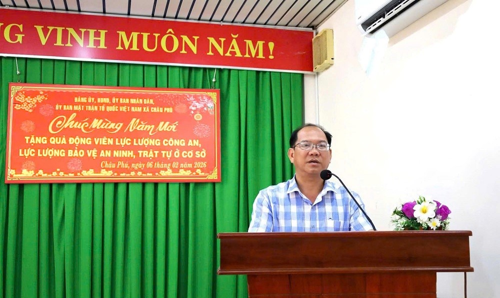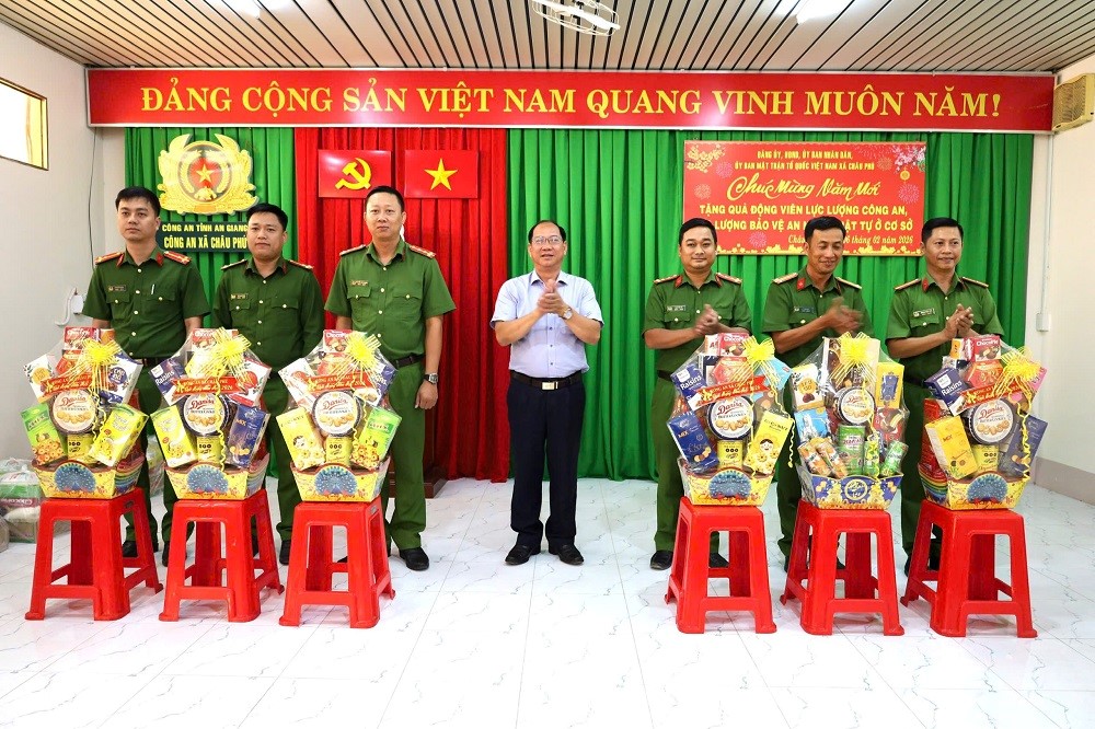 Nhân dịp Xuân Bính Ngọ 2026, đoàn công tác của Đảng ủy, HĐND, UBND, UBMTTQVN xã Châu Phú đã đến thăm, tặng quà cán bộ chiến sĩ Công an xã và lực lượng tham gia bảo vệ an ninh, trật tự ở cơ sở xã Châu Phú nhằm ghi nhận thành tích, động viên, khích lệ tinh thần và chia sẻ khó khăn đối với cán bộ, chiến sĩ trong việc đảm bảo an ninh trật tự trên địa bàn dịp Tết đến.