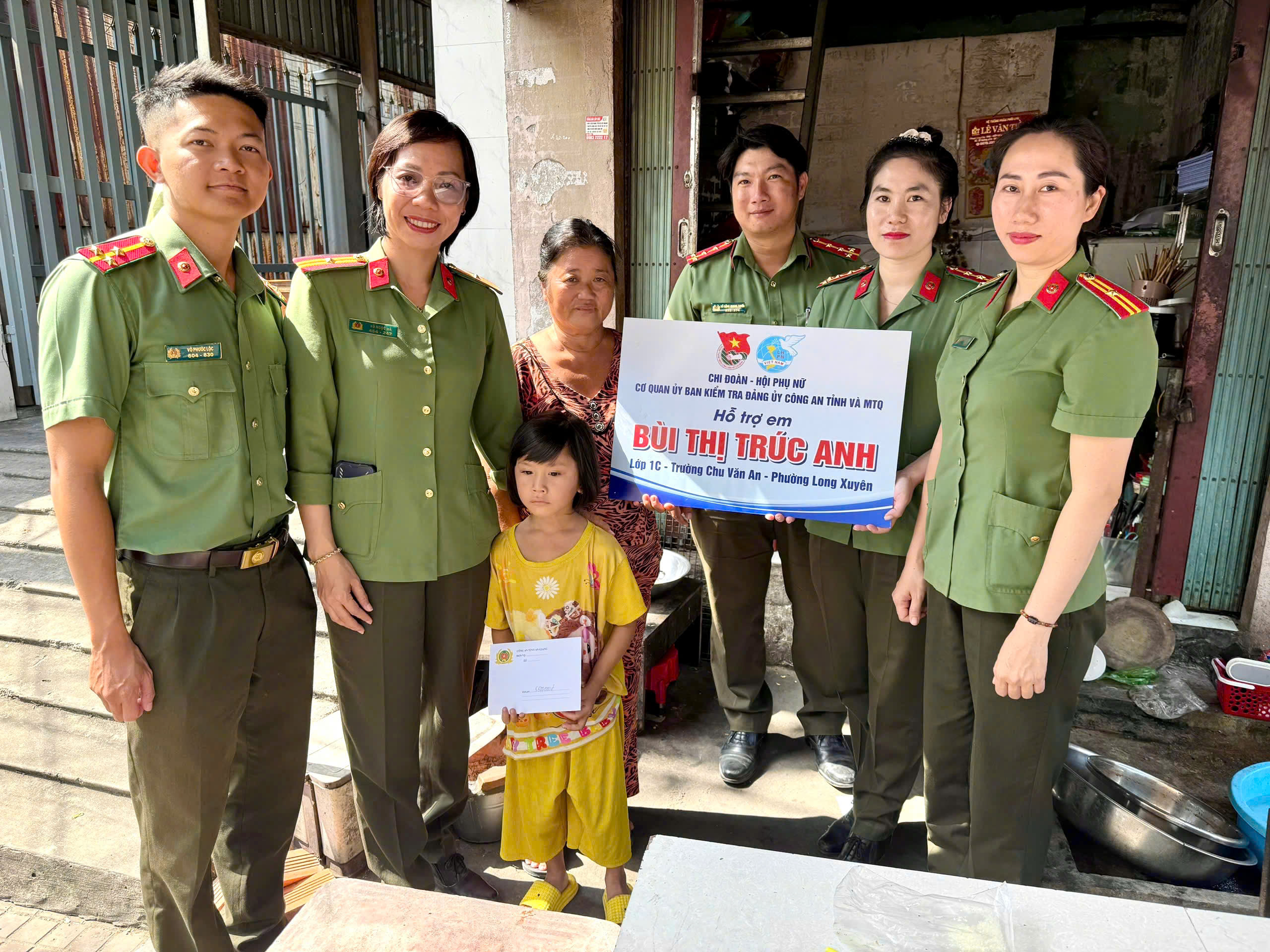 Đoàn đã đến thăm gia đình em Bùi Thị Trúc Anh (SN 2019), hiện em đang học lớp 1, trường Tiểu học Chu Văn An, phường Long Xuyên là trường hợp có hoàn cảnh đặc biệt khó khăn, em và mẹ bị tai nạn giao thông, mẹ em bị chấn thương phần đầu và chân còn em phải phẫu thuật cắt bỏ lá lách, hiện đang trong quá trình phục hồi sức khỏe. Tại gia đình, đại diện Hội Phụ nữ và Chi đoàn đã ân cần thăm hỏi tình hình sức khỏe, chia sẻ những khó khăn mà em và gia đình đang gặp phải, đồng thời trao tặng phần quà tiền mặt 5,5 triệu đồng.