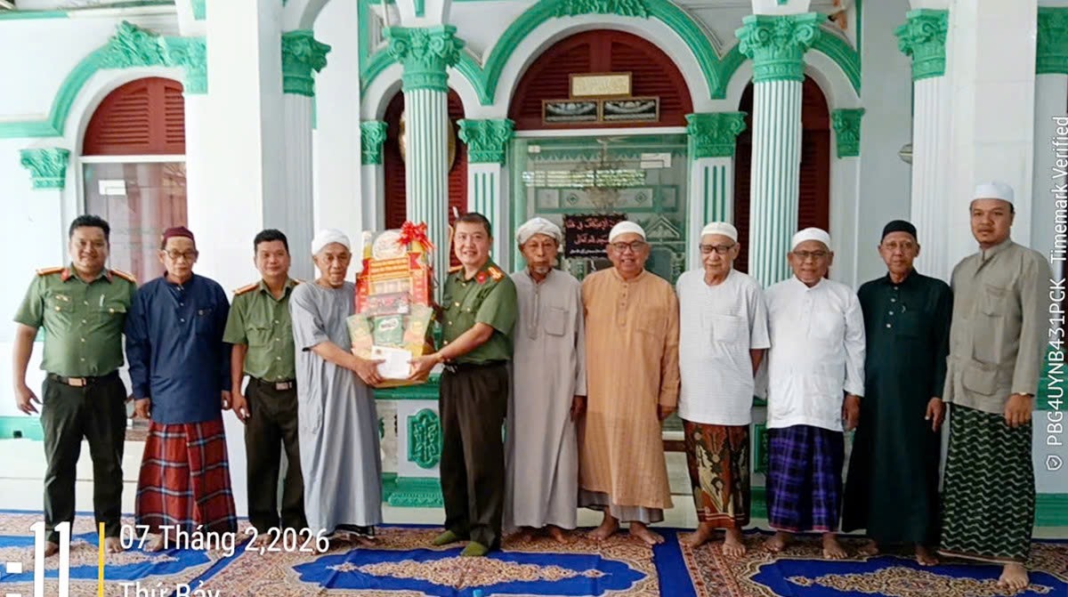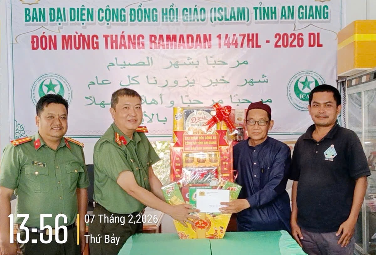 Nhân dịp chuẩn bị đón Tết cổ truyền Bính Ngọ và tháng Ramadan năm 2026, được sự ủy quyền của Ban Giám đốc Công an tỉnh An Giang, ngày 7/2, Lãnh đạo Phòng An ninh nội địa đã đến thăm, tặng quà Ban đại diện cộng đồng Hồi giáo(Islam) tỉnh An Giang; Ban Quản trị Thánh đường Nek Mah và ông Haji Ah Math, Phó Giáo cả.