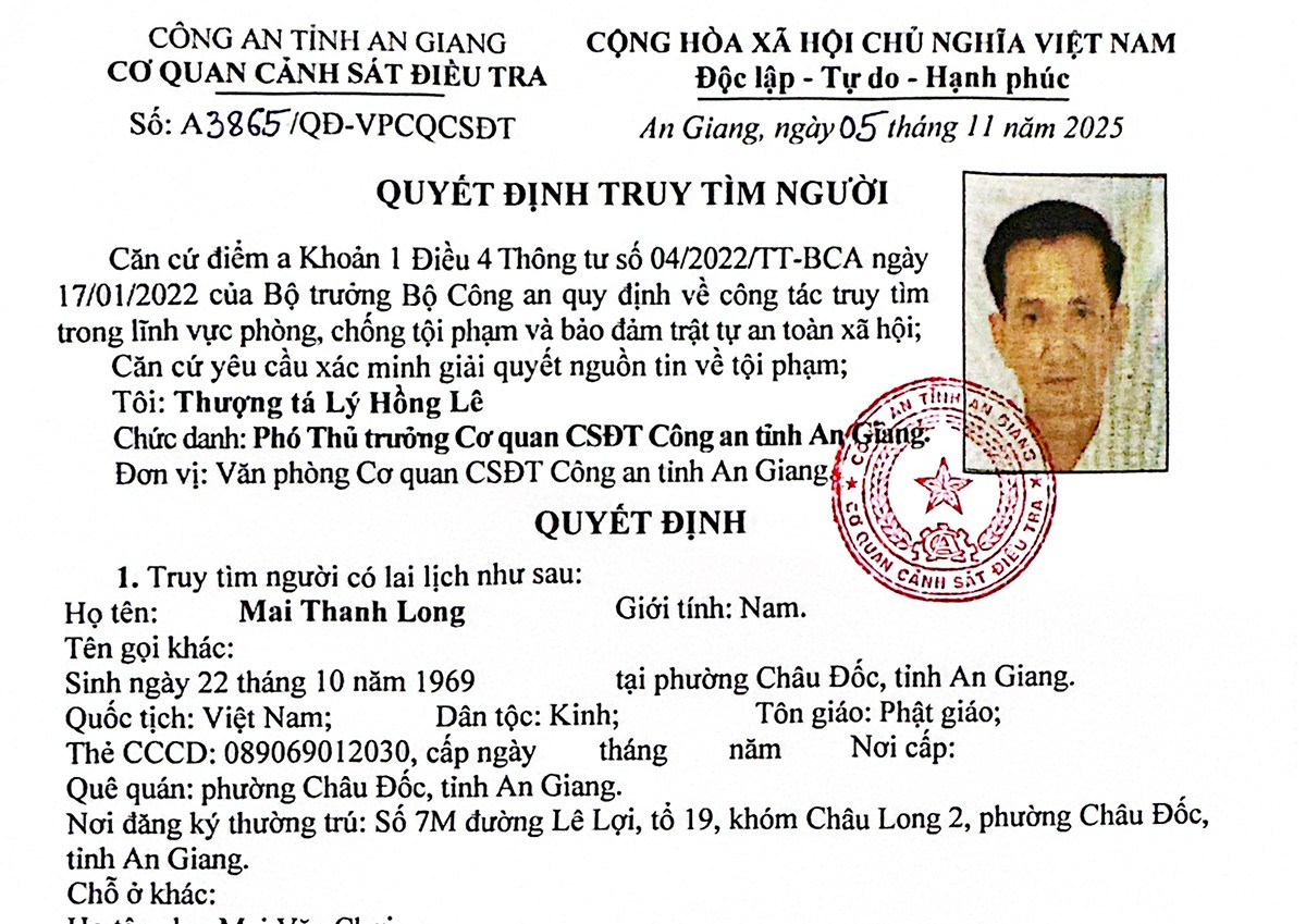 Ngày 10/11, Cơ quan Cảnh sát điều tra (CSĐT) Công an tỉnh An Giang cho biết, vừa ra quyết định truy tìm đối tượng Mai Thanh Long, sinh năm 1969 (cư trú số 7M đường Lê Lợi, phường Châu Đốc, tỉnh An Giang) để phục vụ công tác điều tra vụ án “Lừa đảo chiếm đoạt tài sản”.