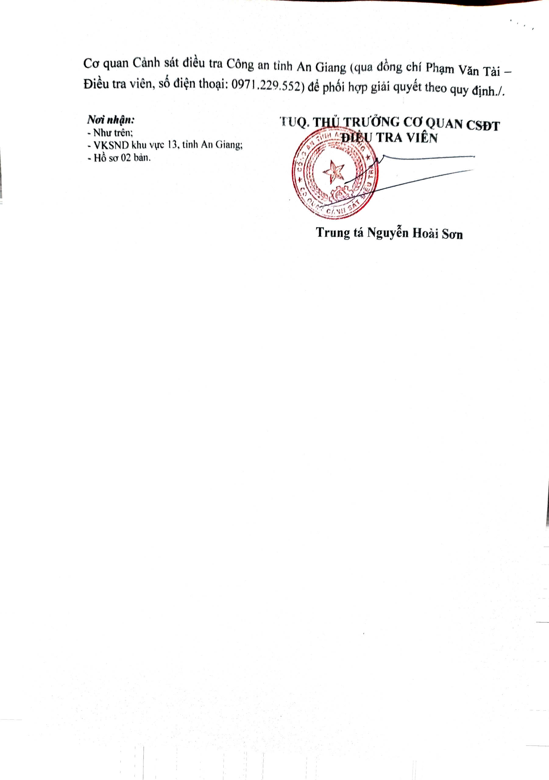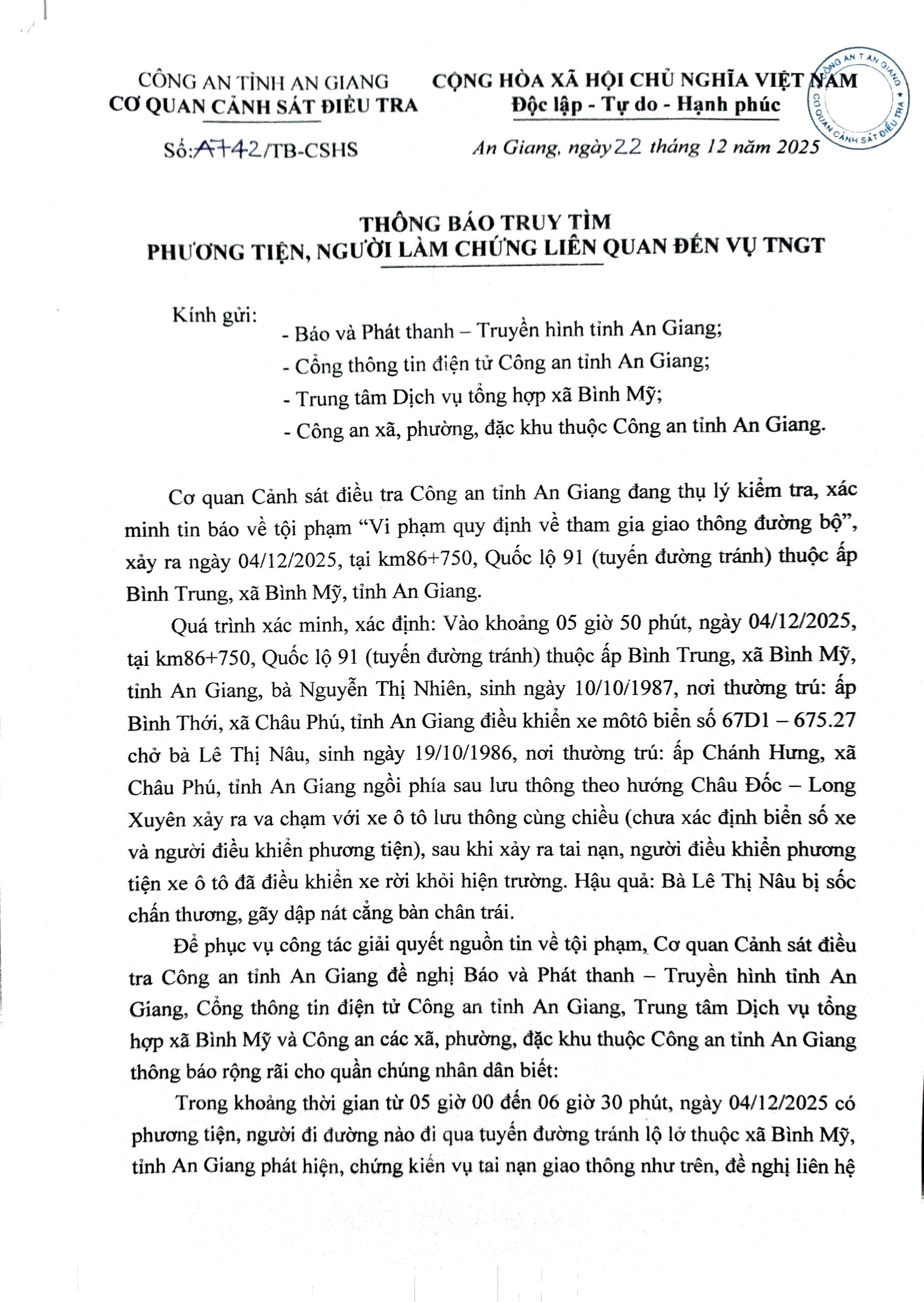 Để phục vụ công tác điều tra, Cơ quan Cảnh sát điều tra Công an tỉnh An Giang đề nghị người điều khiển phương tiện, người đi đường hoặc nhân chứng chứng kiến vụ việc trong khoảng thời gian từ 05 giờ 00 đến 06 giờ 30 phút ngày 04/12/2025 tại khu vực trên, liên hệ đồng chí Phạm Văn Tài – Điều tra viên, số điện thoại 0971.229.552 để phối hợp giải quyết theo quy định.