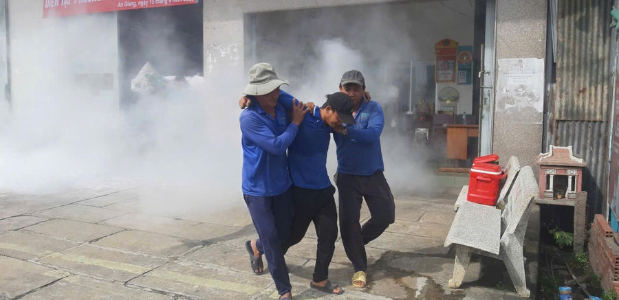 Đưa ra tình huống giả định, đám cháy phát ra từ khu vực kho chứa phân bón và có dấu hiệu lan sang khu vực phòng giao dịch của công ty. Nguyên nhân xảy ra cháy do chập điện, chất cháy chủ yếu là thiết bị máy móc, dây chuyền công nghệ đường ống kĩ thuật... Lúc này, có 2 người bị thương và mắc kẹt bên trong do ngạt khói. Lực lượng chữa cháy cơ sở khẩn trương cứu người và tài sản đến nơi an toàn, sử dụng các thiết bị chữa cháy được trang bị sẵn nhằm hạn chế cháy lan, cháy lớn. Đồng thời, gọi điện thoại qua số 114 đến lực lượng Cảnh sát Phòng cháy, chữa cháy và cứu nạn, cứu hộ chuyên nghiệp đến ứng cứu kịp thời.