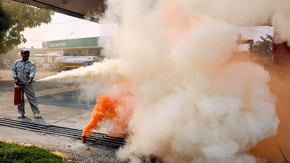 Tình huống giả định, trong lúc bơm xăng cho một xe máy, do xăng dầu rò rỉ ra bên ngoài tiếp xúc nguồn nhiệt gây cháy tại khu vực trụ bơm. Khi phát hiện sự cố, nhân viên cửa hàng xăng dầu đã nhanh chóng phát tín hiệu báo động, cắt điện và sử dụng các phương tiện chữa cháy ban đầu như bình chữa cháy xách tay để khống chế đám cháy, đồng thời gọi điện báo cháy cho lực lượng chữa cháy chuyên nghiệp.