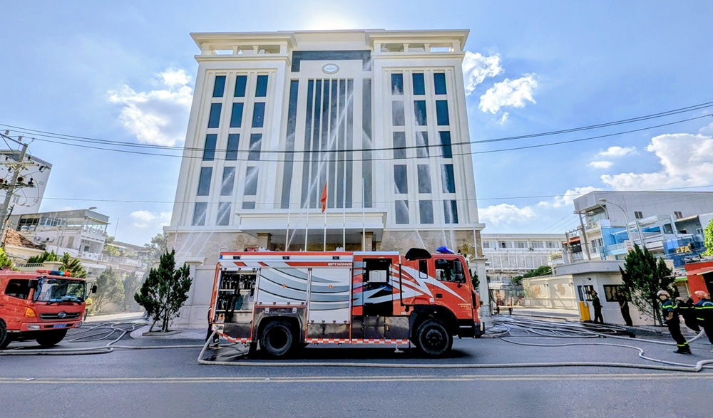 Nhận được tin báo cháy, Tổ chữa cháy và cứu nạn cứu hộ Mỹ Thới lập tức điều động 3 xe chữa cháy; 01 xe cứu nạn cứu hộ; 01 xe chỉ huy, cùng 30 cán bộ chiến sĩ nhanh chóng đến ngay hiện trường triển khai đội hình, phối hợp cùng lực lượng chữa cháy của Ngân hàng tiến hành chữa cháy. Lực lượng chữa cháy chuyên nghiệp đã dùng các vòi phun nước dập lửa, làm mát các khu vực lân cận chóng cháy lan và sử dụng thiết bị chuyên dụng giải cứu các nạn nhân còn mắc kẹt trong khu vực có khói độc thoát ra ngoài an toàn, đặc biệt ngăn chặn rủi ro an ninh trong quá trình xử lý sự cố cháy. Sau khoảng 15 phút phối hợp tích cực chữa cháy giữa các lực lượng, đám cháy giả định đã được dập tắt hoàn toàn.