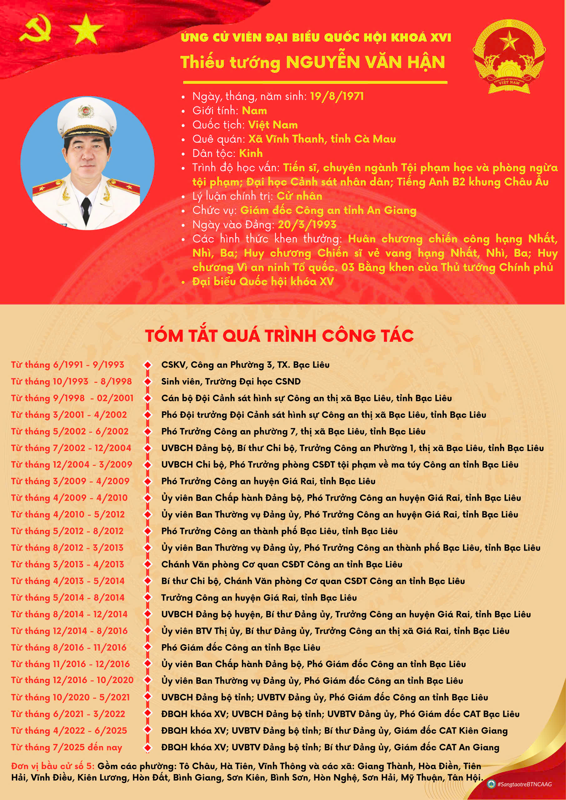 Trang Thông tin điện tử Công an tỉnh An Giang trân trọng giới thiệu tiểu sử đồng chí Thiếu tướng Nguyễn Văn Hận, Ủy viên Ban Thường vụ Tỉnh ủy, Bí thư Đảng ủy, Giám đốc Công an tỉnh An Giang. Đồng chí được cấp ủy, chính quyền, Mặt trận Tổ quốc Việt Nam tỉnh và cử tri tín nhiệm giới thiệu tham gia ứng cử Đại biểu Quốc hội khóa XVI, nhiệm kỳ 2026 – 2031, tại tỉnh An Giang - đơn vị bầu cử số 5.